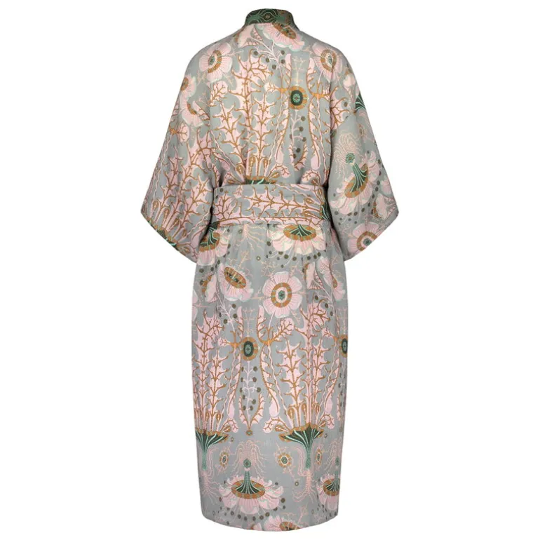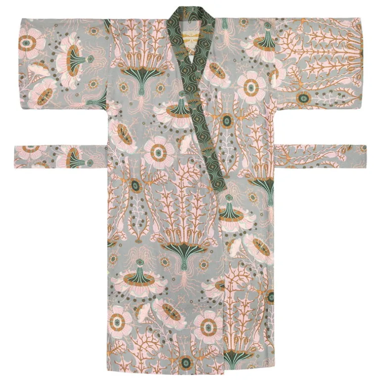 På Klaus Haapaniemis morgonrock Equinoxe Yukata visas ett förtrollande mönster med blommor som endast slår ut på natten. Unisexkimonon i japansk stil är tillverkad i Finland av 100 % linne, och till den medföljer ett långt, brett skärp med matchande tryck.