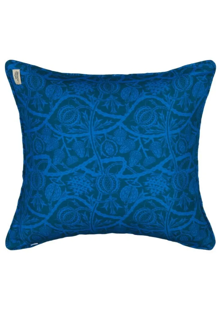 Klaus Haapaniemis kuddfodral Lynx Moonlight visar en nordisk skogskatt som njuter av månskenet, omgiven av dekorativa tistlar. Det här fyrkantiga kuddfodralet är tillverkat av en blandning av linne och bomull och har en dold dragkedja. Tistelmönstret fortsätter på baksidan av kudden i blå nyanser.