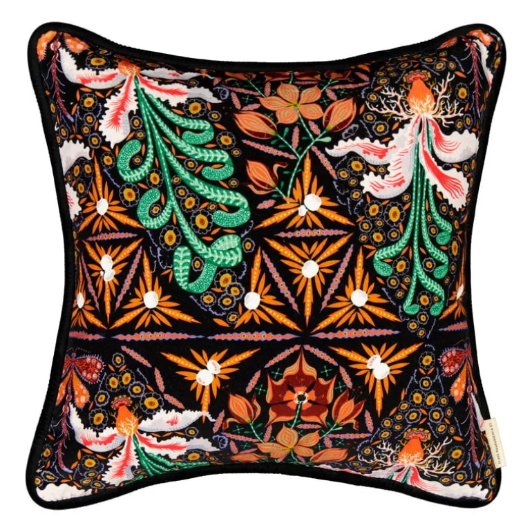 Klaus Haapaniemis kuddfodral Moonflower är illustrerat med ett förtrollande mönster med blommor som bara slår ut på natten. Det kvadratiska kuddfodralet är tillverkat av mjuk bomullssammet och har en dold dragkedja och svart sammetspasspoal.