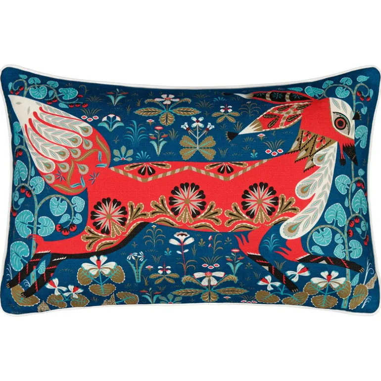 Klaus Haapaniemis förtrollande kuddfodral Running Fox är illustrerad med en röd räv bland detaljrik flora. Mönstret har handtryckts på båda sidor av fodralet, som är tillverkat av en högkvalitativ blandning av linne och bomull. Kuddfodralet har dold dragkedja och vit passpoal.