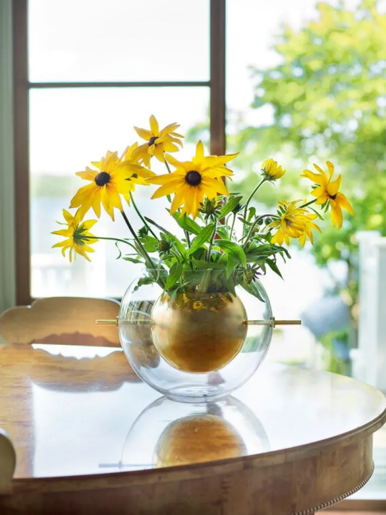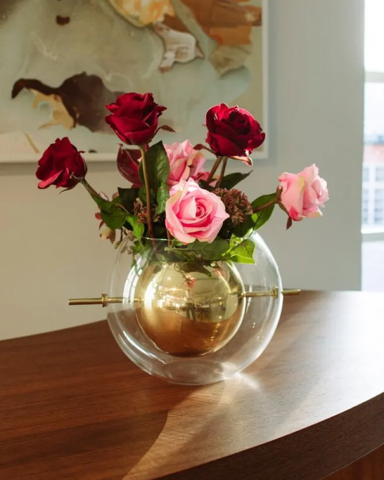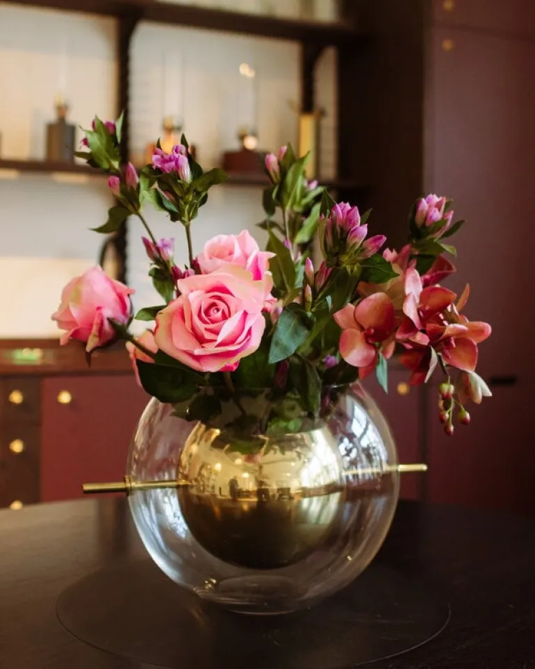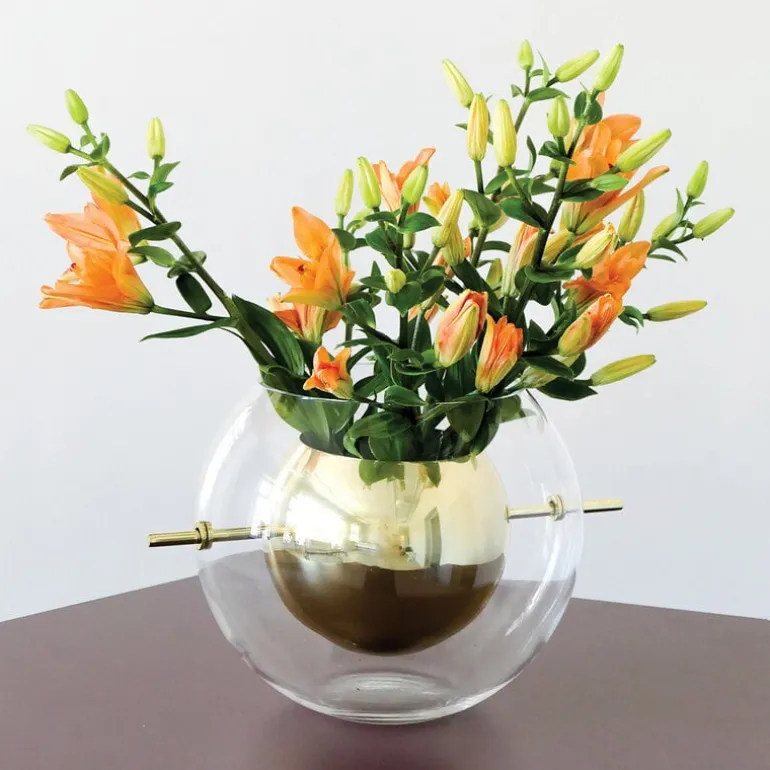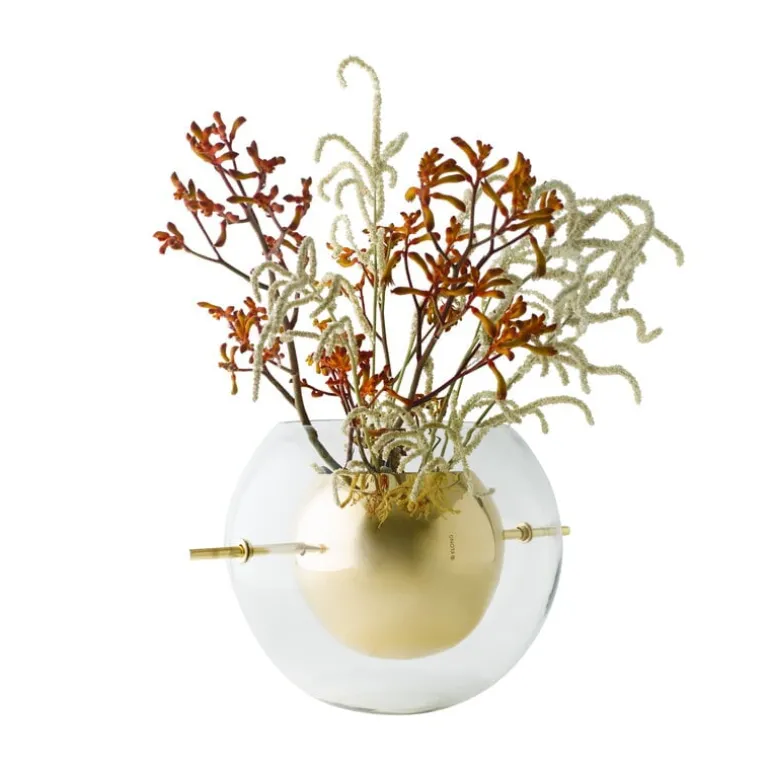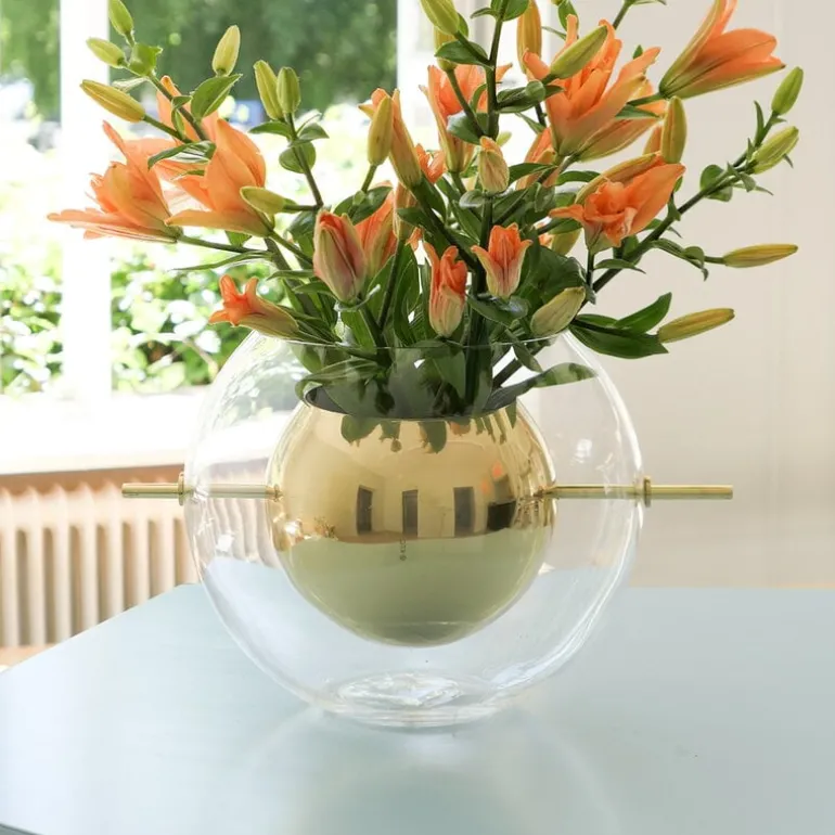 Klongs vas Alba ger en sofistikerad touch till alla utrymmen. Den eleganta vasen kombinerar en rundad glasskål med en inre hållare i mässing, som perfekt vaggas av blomsterbuketter och döljer deras stjälkar, vilket skapar en illusion av att blommorna växer direkt från en gyllene bas. Alba-vasen, som är designad av Mika Lindblad, är en fängslande fokuspunkt, oavsett om den är fylld med blommor eller står graciöst på egen hand.