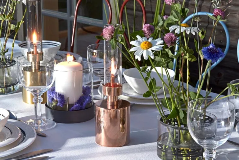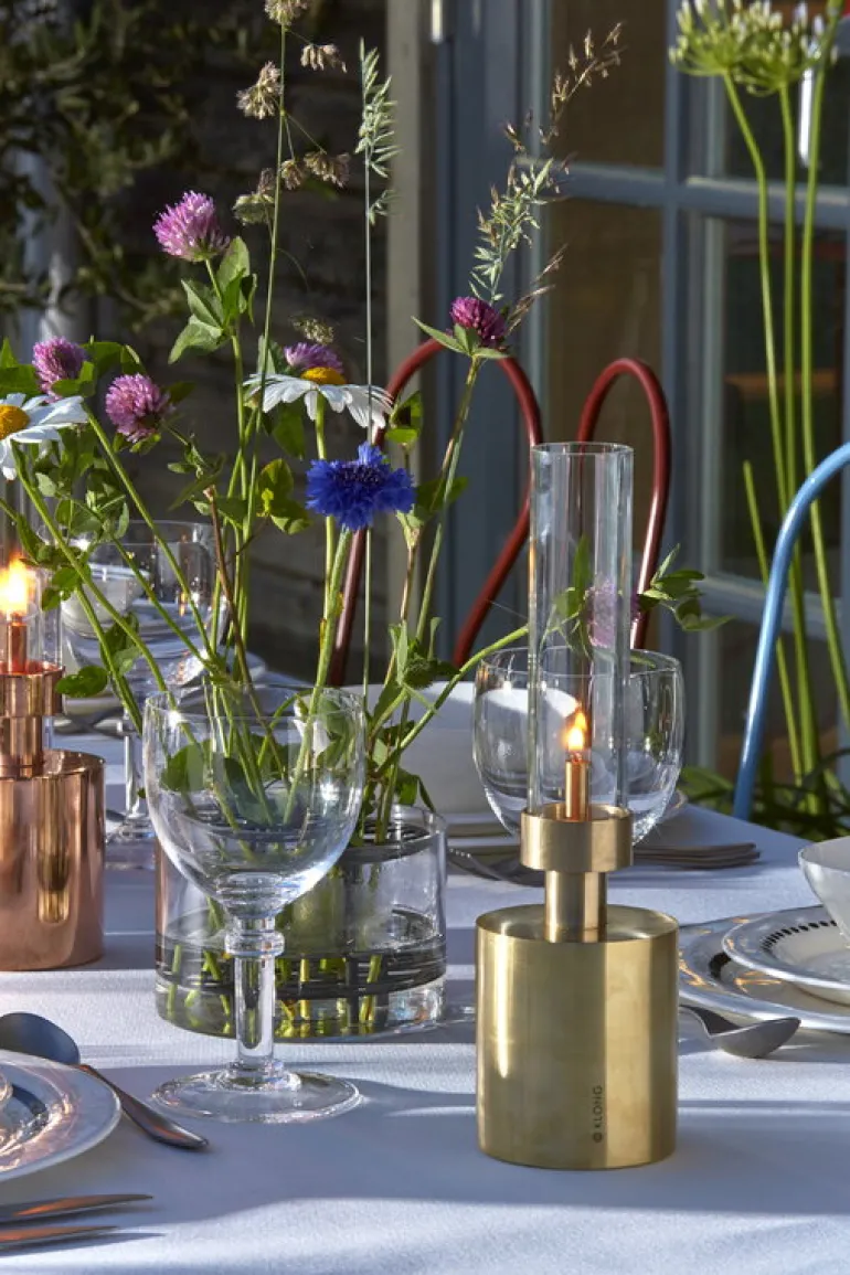 Äng från Klong har designats av Eva Schildt och är en spännande vas som gör det superlätt att skapa vackra blomsterarrangemang. Namnet Äng refererar till hur blommorna står i vasen: mässingsramen med dubbla nivåer håller stjälkarna upprätta och åtskilda. Den vackra ramen vilar i en cylinderformad skål av blåst glas. Skapa en urban blomsteräng i ditt hem med den fina Äng-vasen, eller visa upp den som ett skulpterat designobjekt.