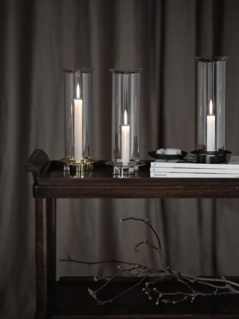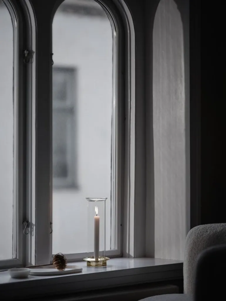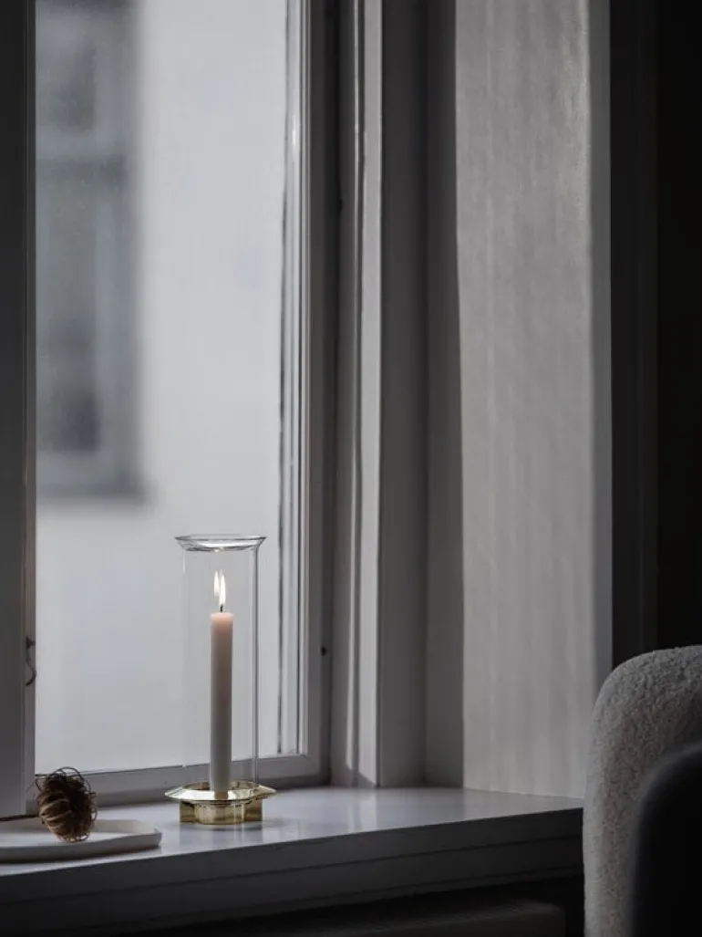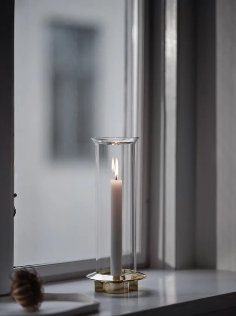 Klongs ljushållare Fyr är en förtjusande elegant och säker hållare för ett enskilt ljus, perfekt som utsmyckning på fönsterbrädet eller som mittpunkt i ett bordsarrangemang. Designduon Broberg & Ridderstråles vision var att konstruera en ljusstake som passade till både antikljus och värmeljus och som skyddade ljuslågan mot plötsliga luftströmmar med hjälp av ett elegant, strömlinjeformat glashölje. Ljusstaken Fyr kommer till sin fulla rätt tack vare mässingsfoten med accenter, som ger den en sofistikerad touch.
