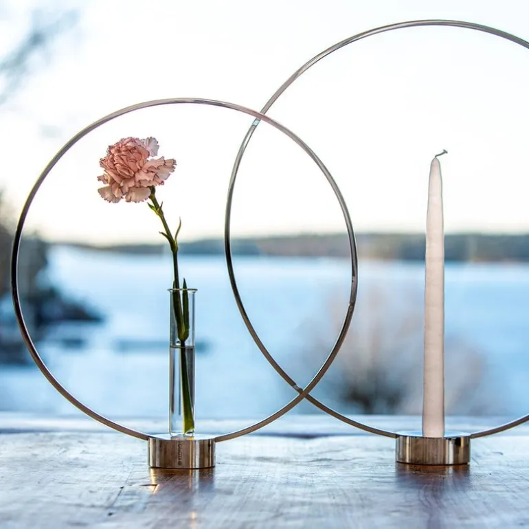 Ljusstaken Gloria från Klong har en liten, cylinderformad bas och en fin gloria som ramar in ljuset och glittrar vackert i ljuset. Detta vackra föremål, som är designat av svenska Broberg & Ridderstråle, är tillverkat av nickelpläterad mässing som ger det en vacker silverliknande glans.