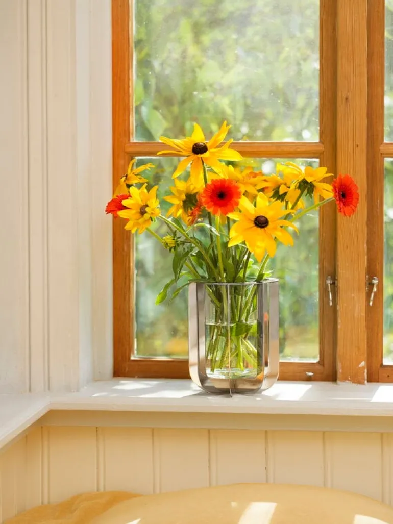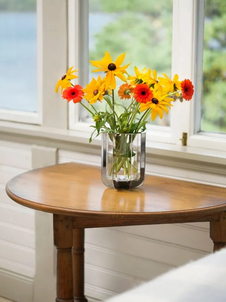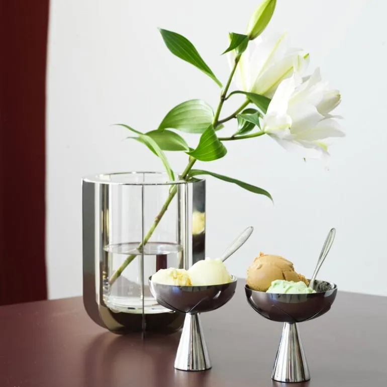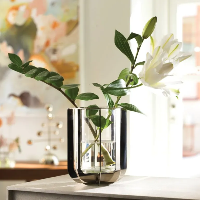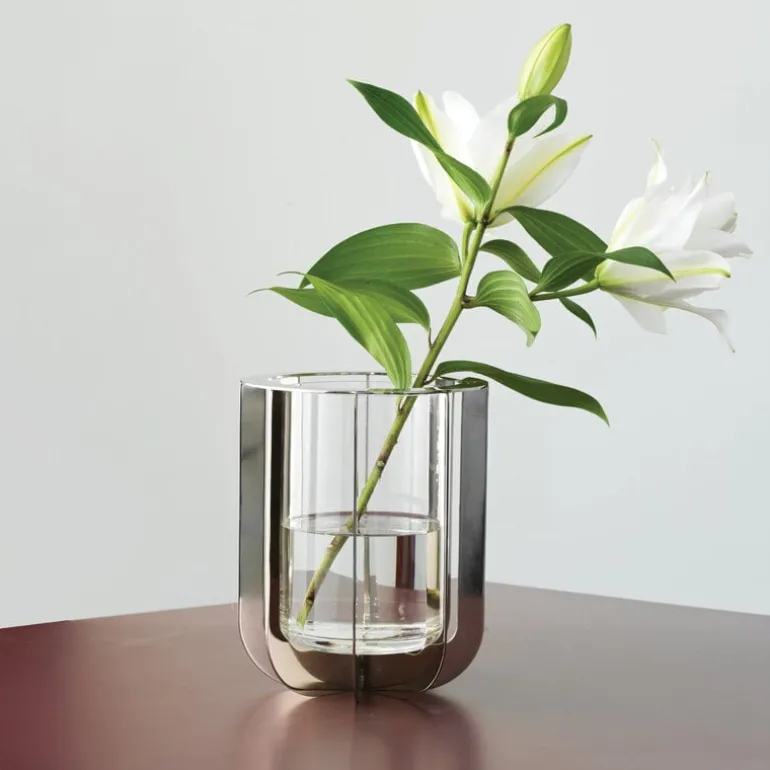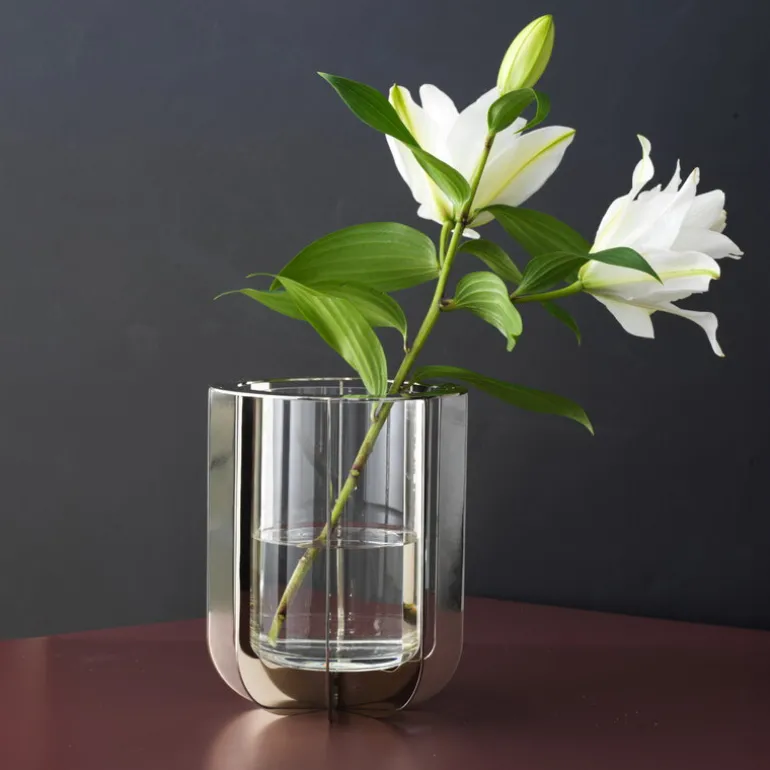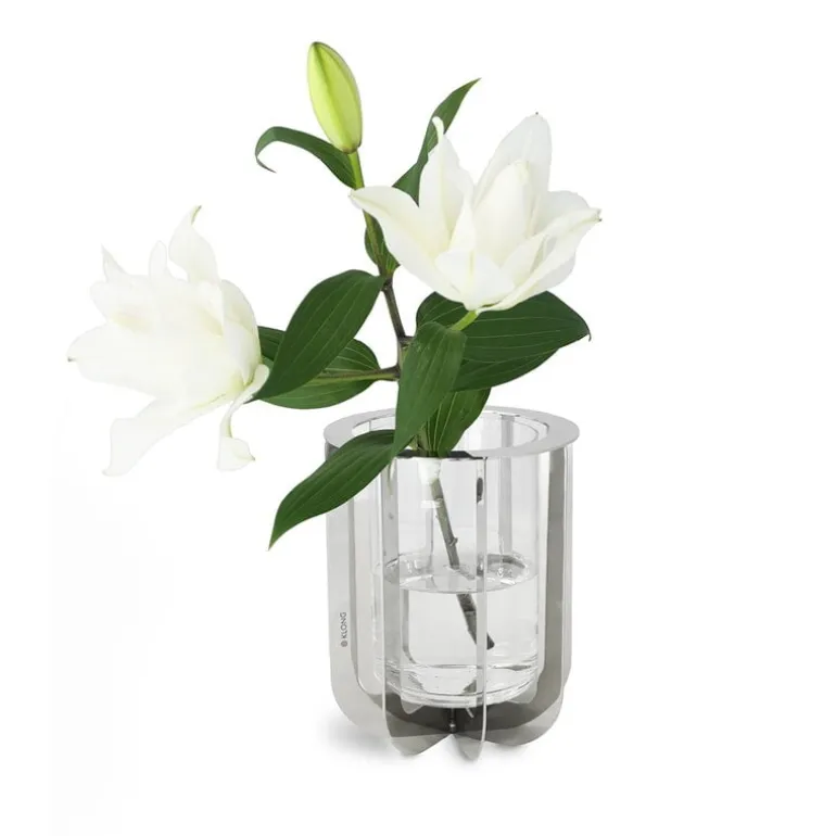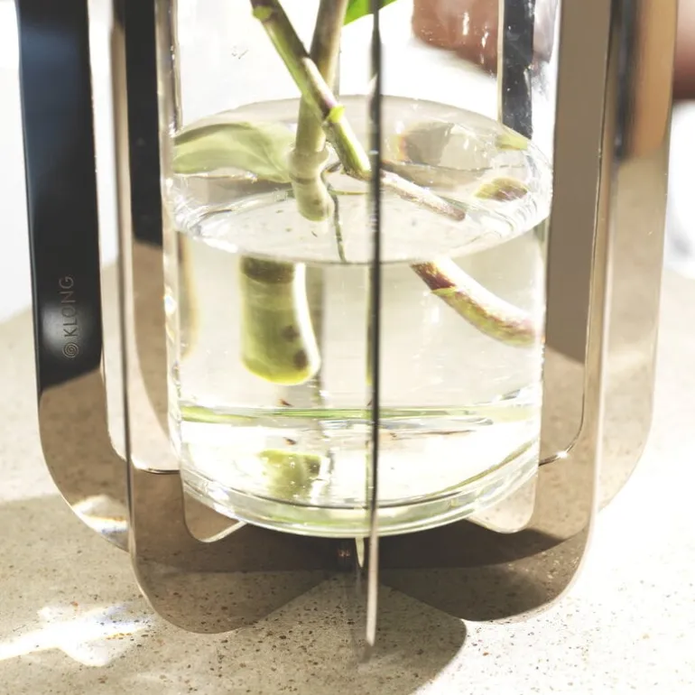 Vasen Jazz från Klong kombinerar praktiskt användande med skönhet. Den dekorativa, pulverlackerade stålramen döljer en transparent glasbehållare som enkelt kan tas ut för rengöring. Vasen, som är designad av Anki Gneib, påminner om den livfulla andan från 1920-talets art déco och jazzklubbsvibbar. Vasen är en riktig blickfångare, oavsett om den är fylld med frodiga, färgglada buketter eller enklaste kvistar.