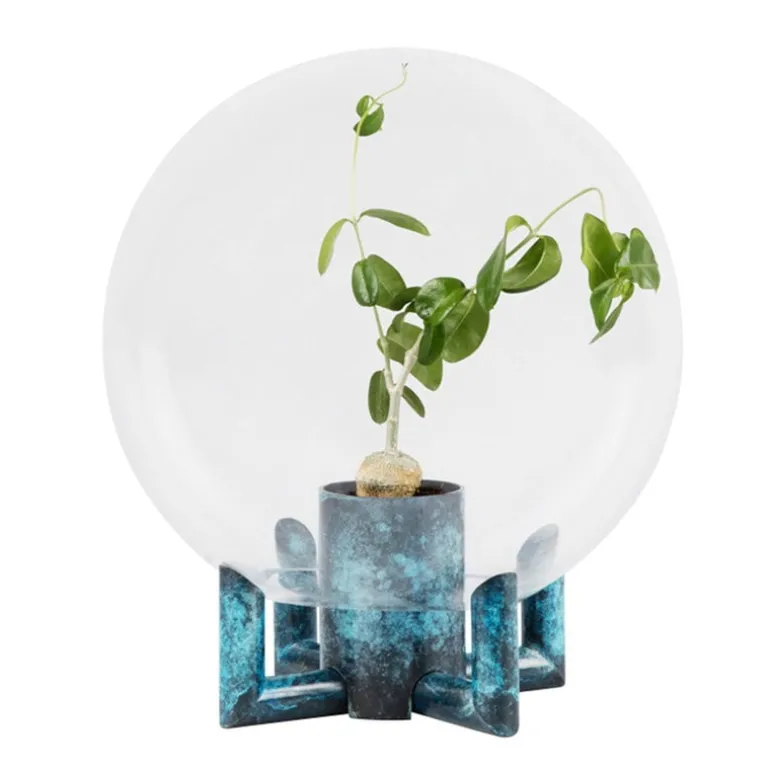 Vasen Orb av Klong är ett fint multifunktionellt föremål som består av en rund, munblåst glasglob med bas och vattenbehållare i oxiderad mässing. När den placeras på en växt fungerar globen som ett växthus och passar därför bäst till plantor som trivs med hög fuktighet och värme. När den placeras tvärtom kan glasskålen fyllas med vatten och användas som vas för större buketter.