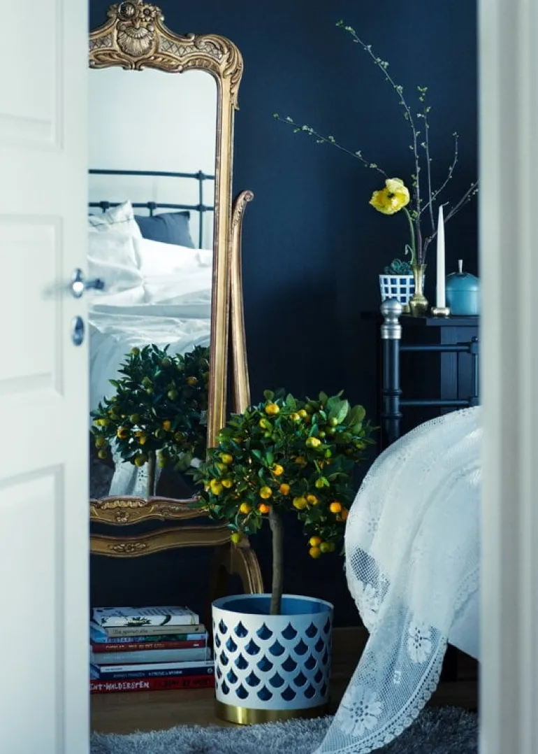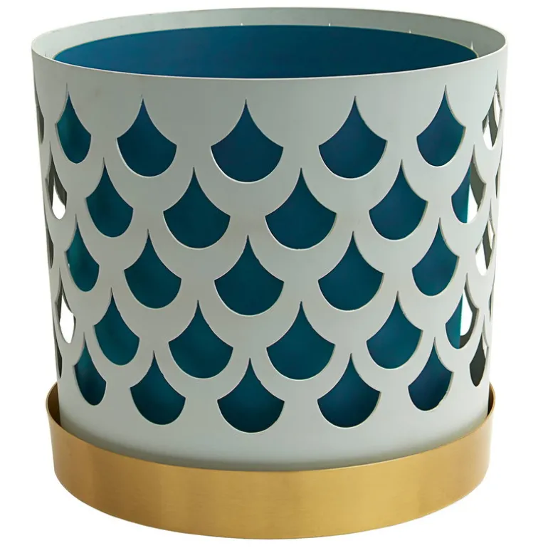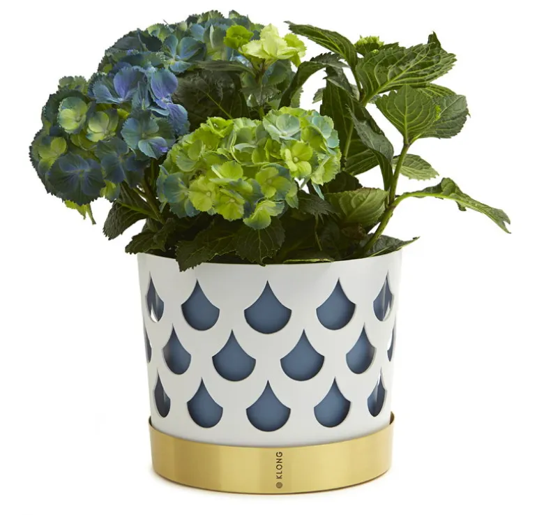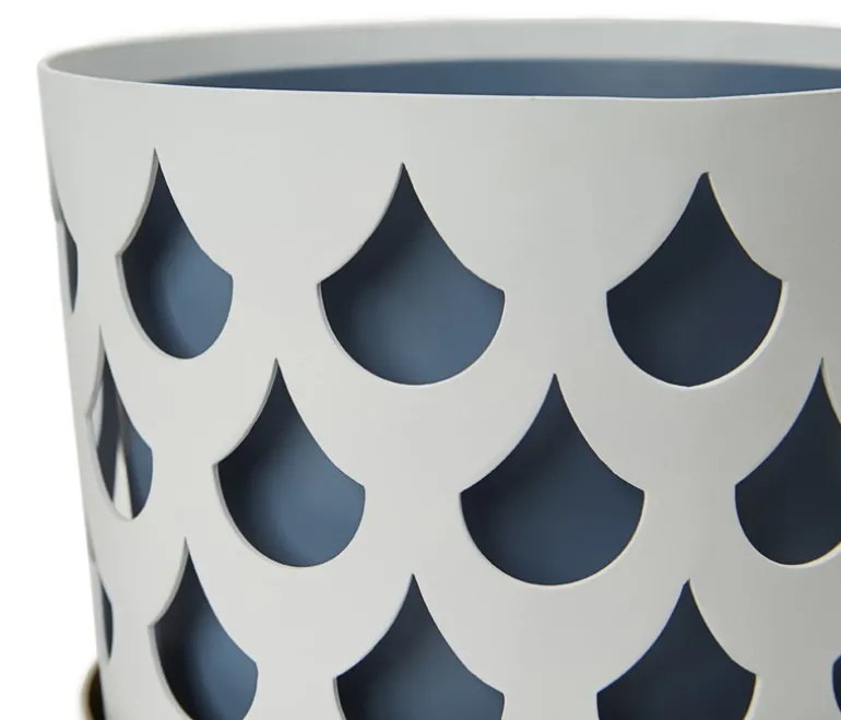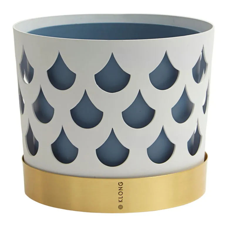 Trio-blomkrukan från Klong består av tre olika element: en blå innerkruka, ett stållager med hålmönster och ett lackerat mässingsfat. Trio-krukorna, som designats av Ania Pauser, skapar en spännande kontrast till gröna växter – och de olika storlekarna och färgerna i kollektionen passar bra tillsammans.
