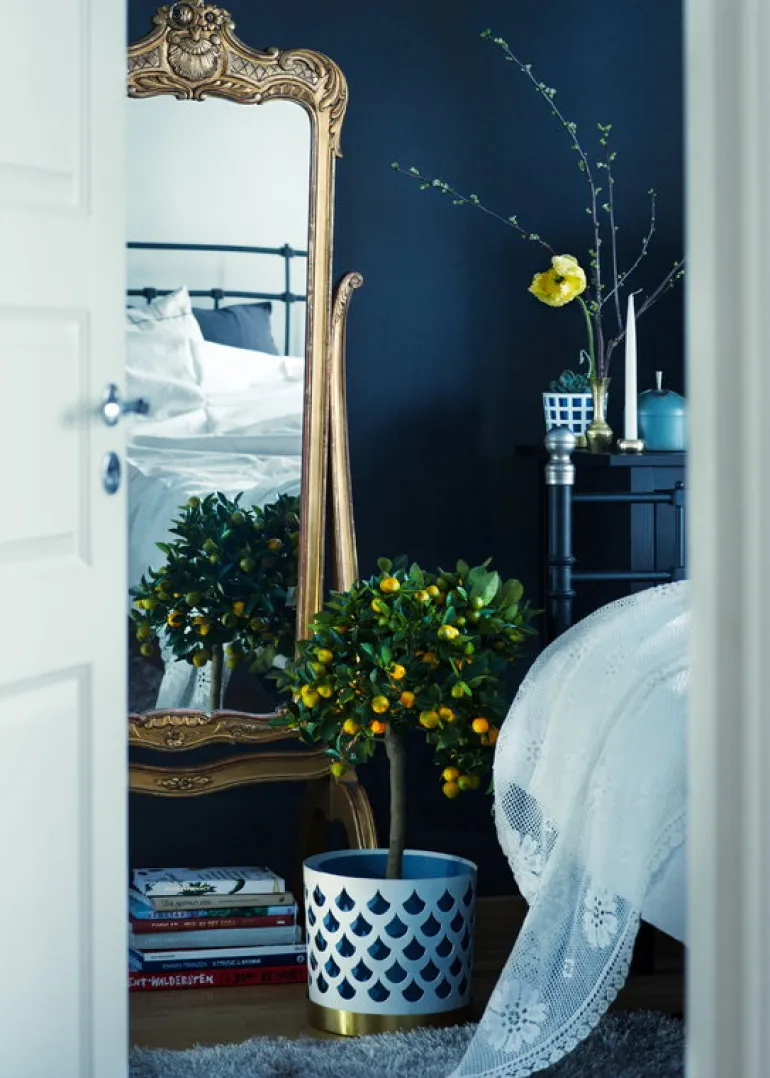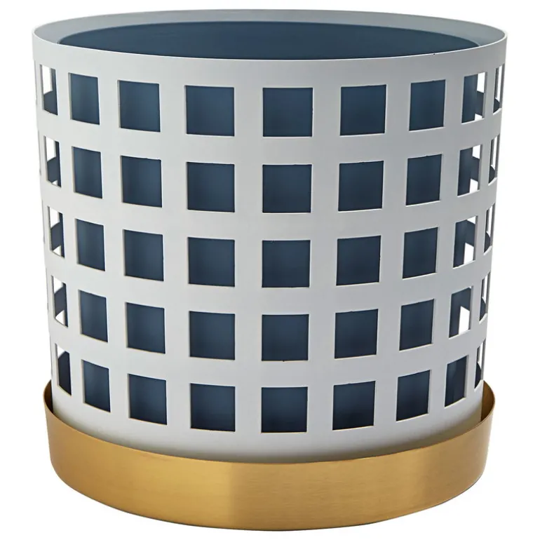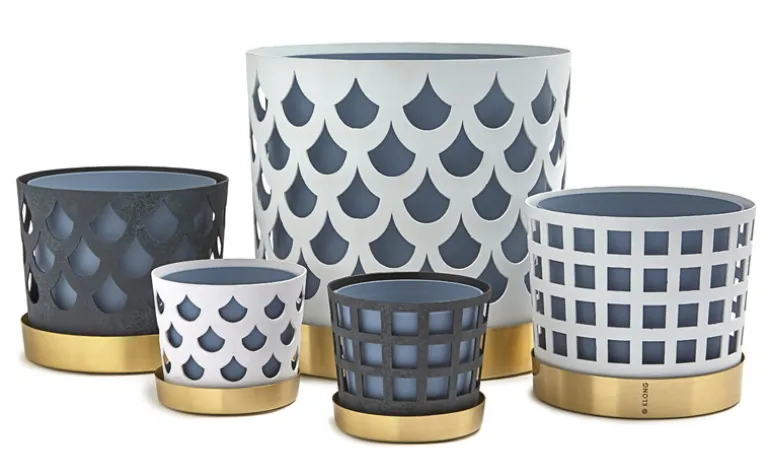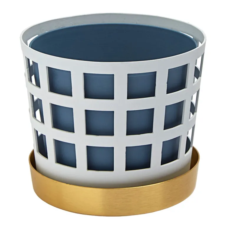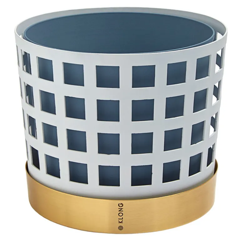 Trio-blomkrukan av Klong består av tre olika element: en blå innerkruka, ett stållager med hålmönster och ett lackerat mässingsfat. Trio-krukorna, som designats av Ania Pauser, skapar en spännande kontrast till gröna växter – och de olika storlekarna och färgerna i kollektionen passar bra tillsammans.