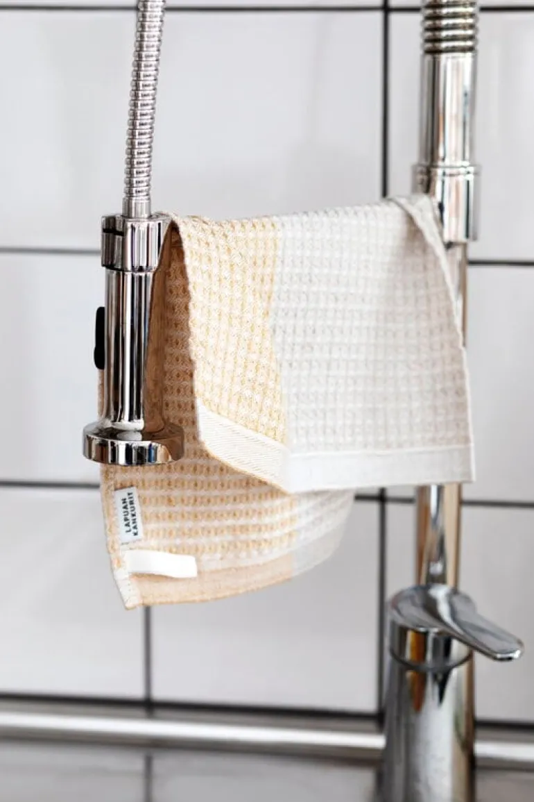 Disktrasan Eeva från Lapuan Kankurit är tillverkad av en tvättad blandning av linne, bomull och Tencel, ett miljövänligt material som är mycket absorberande men också torkar snabbt. Den lätta, multifunktionella trasan kan också användas som ansiktsservett, rengöringsduk eller till och med för att rengöra dina glasögon.