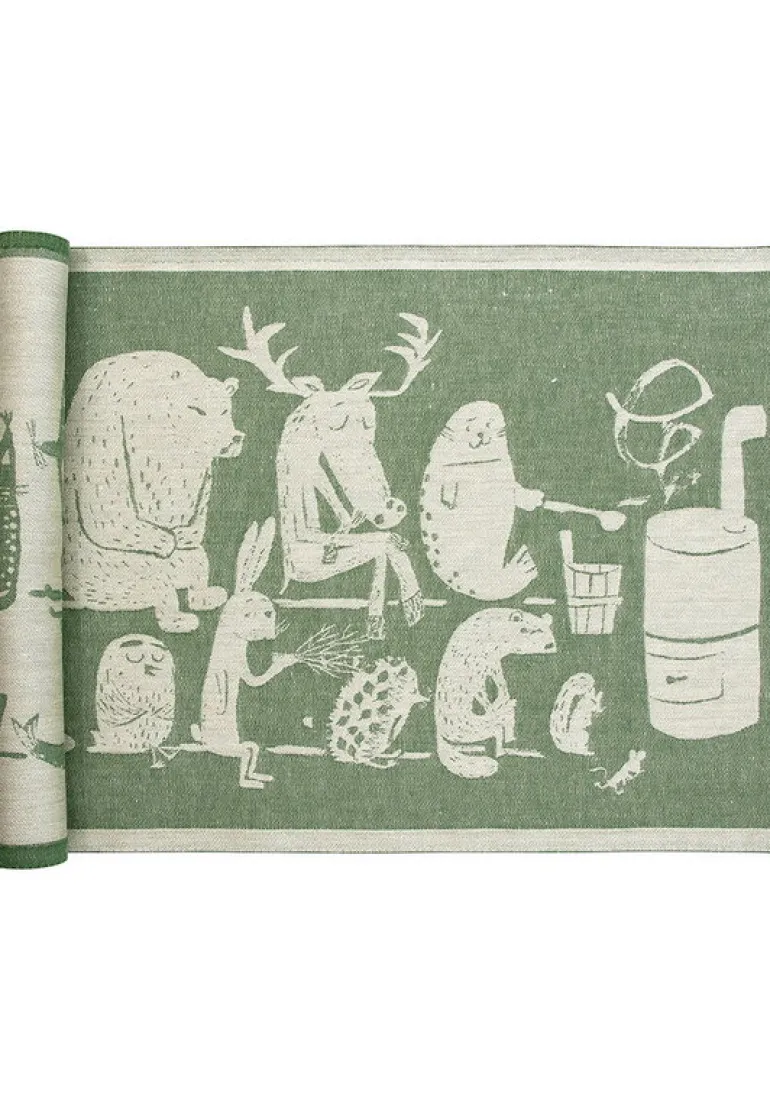 Eläinten Sauna, från Lapuan Kankurit, pryds av en illustration av Matti Pikkujämsäs som föreställer en grupp finska djur som avnjuter ett traditionellt bastubad – Eläinten Sauna är finska för ”djurbastu”. Underlaget är tillverkat i en blandning av europeisk bomull och linne, och har en känsla av kvalitet och hantverkstradition. Sittunderlaget Eläinten Sauna vävs i Finland.