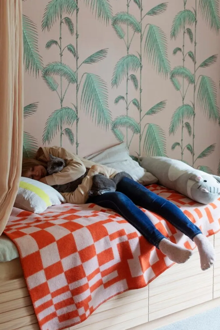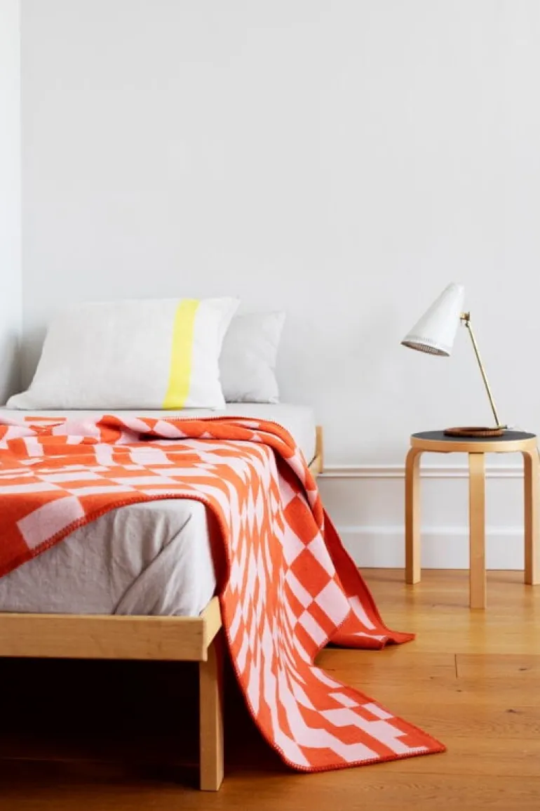 Filten Koodi från Lapuan Kankurit är prydd med ett underbart asymmetriskt rutmönster som formgivits av Elina Helenius. Den är baserad på en av Helenius tidigare skapelser, Huvila, och det extra långa, vävda tyget hon skapade till utställningen inför Lapuans Kankurits 50-årsjubileum år 2023: på Koodi finns det med en detalj från det 4,5 meter långa tygkonstverket.