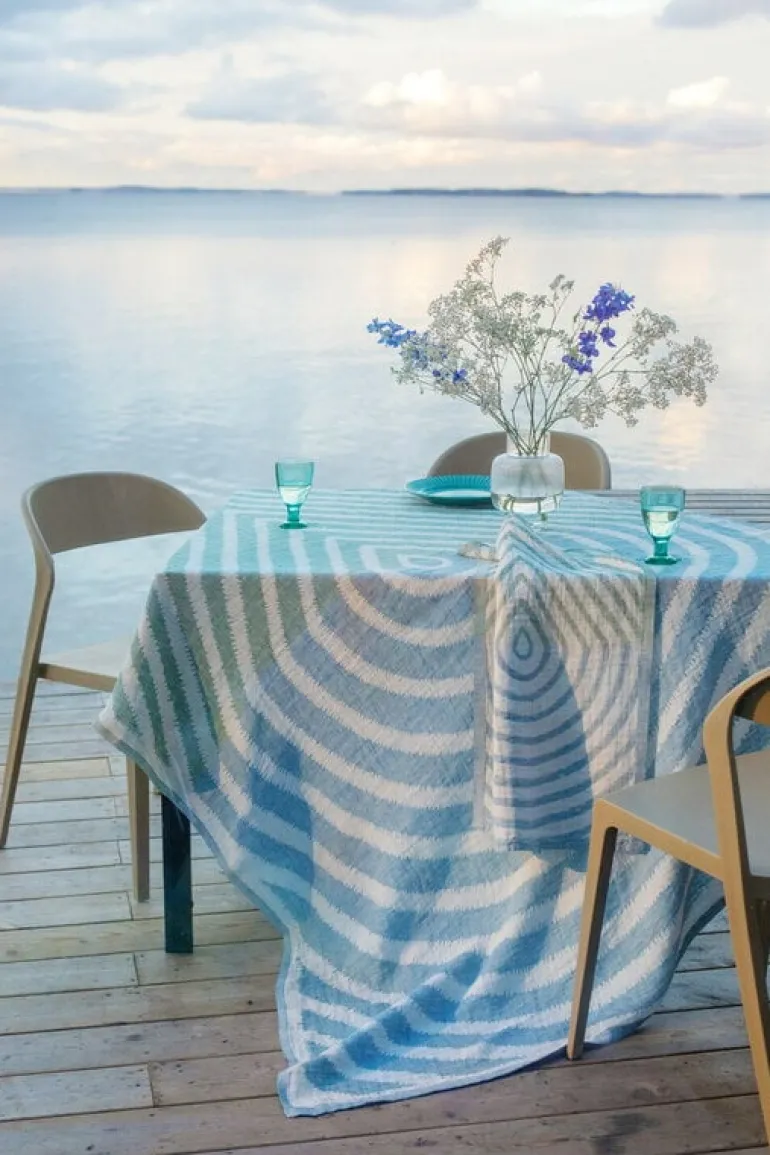 Bordsduken Metsälampi från Lapuan Kankurit pryds av det vackra mönstret Metsälampi, som har formgivits av Akira Minagawa. Det charmiga mönstret tar dig med ut till naturen och de flyende formerna i tjärnens vatten – namnet ”Metsälampi” betyder skogstjärn på svenska. Använd det multifunktionella linnetyget som vacker bordsduk för att fullända dukningen. Tyget kan även nyttjas som tunn filt i sommarvärmen, som gardin i fönstret eller som picknickfilt i parken.