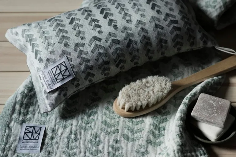 Ruusu x Hvitträsk handduk från Lapuan Kankurit har ett vackert rosmönster av Reeta Ek som vann utmärkelsen Finnish Young Designer of the Year 2017. Ruusu x Hvitträsk är en kollektion med bastutextilier som tagits fram i samarbete med Finlands nationalmuseum. Rosentemat har sitt ursprung i den finska arkitekten Eliel Saarinens nationalromantiska verk, inspirationen hittades i hans lantliga ateljé Hvitträsk som idag är ett museum. Ruusu x Hvitträs handdukar är gjorda av 100% linne och vävs i Finland på Lapuan Kankurits egna väveri.