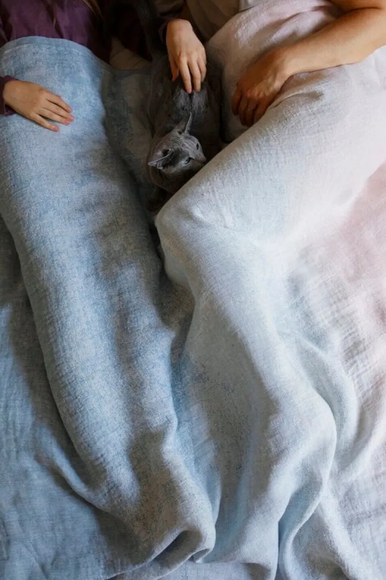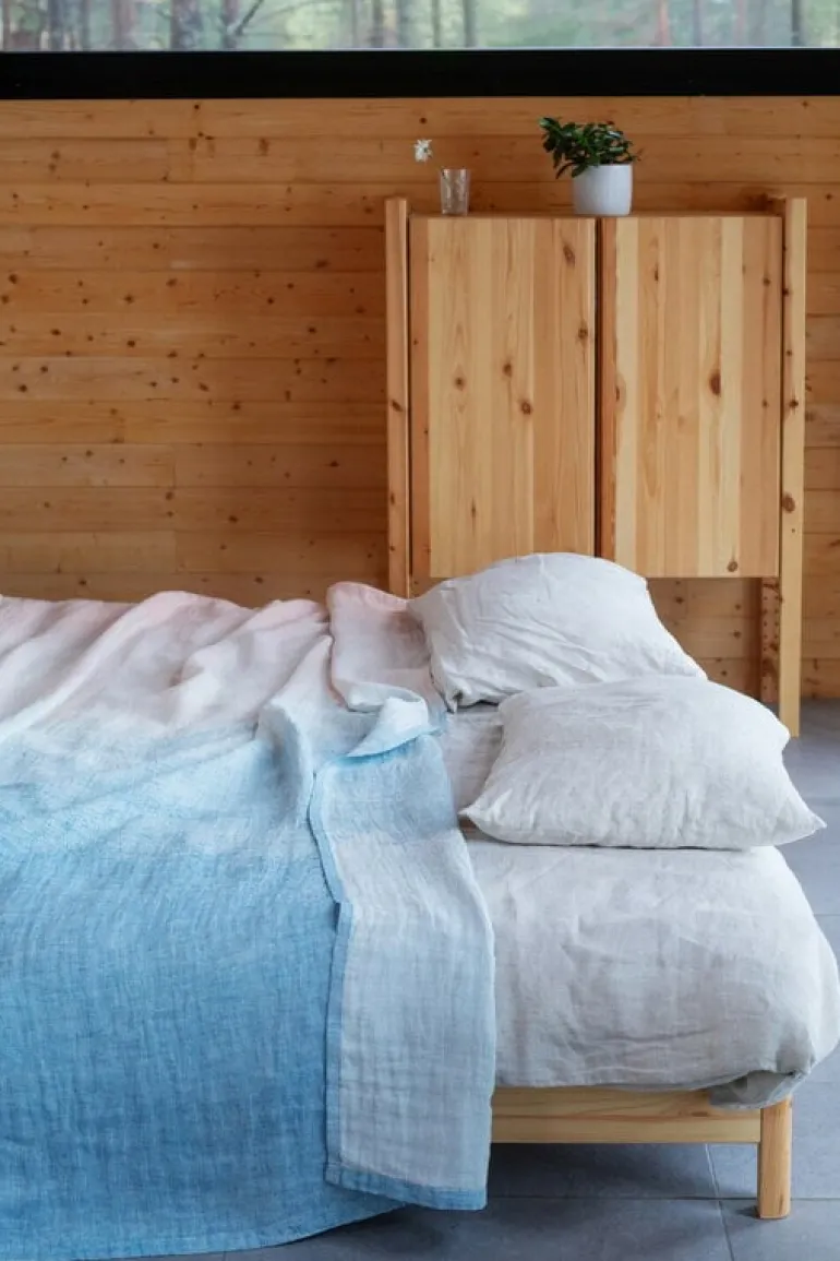 Tyget Saari tillverkas i Finland av tvättat, europeiskt linne, ett lättskött material med en naturligt lättsam framtoning. Du behöver inte stryka filten – de små rynkorna och vecken ger den en charmigt avspänd och naturlig look.