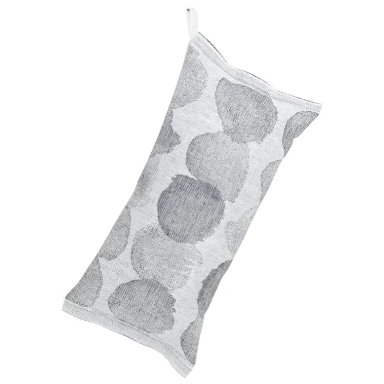 Sade-kollektionen från Lapuan Kankurit har ett enkelt, prickigt mönster designat av Aoi Yoshizawa. Designen inspirerades av regndroppar – prickarna är alla skarpt arrangerade men skiljer sig något från varandra. Kudden är tillverkad av en blandning av linne och bomull och fylld med brandresistent polyesterfiber, och har vävts i Finland vid Lapuan Kankurits egna väveri.