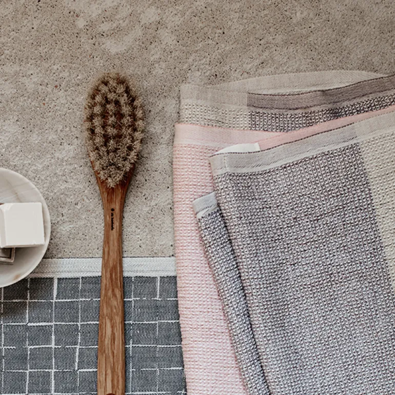 Terva-kollektionen från Lapuan Kankurit är gjord av en innovativ blandning av europeiskt linne, Tencel och bomull med Öko-Tex-standard. Det lättviktiga materialet är högabsorberande och torkar snabbt, samt känns behagligt mot huden. Terva-kollektionen inkluderar handdukar, stolsskydd för bastu och badrockar i olika storlekar och material – och tillverkningen sker huvudsakligen vid Lapuan Kankurits eget väveri i Lapua, Finland.