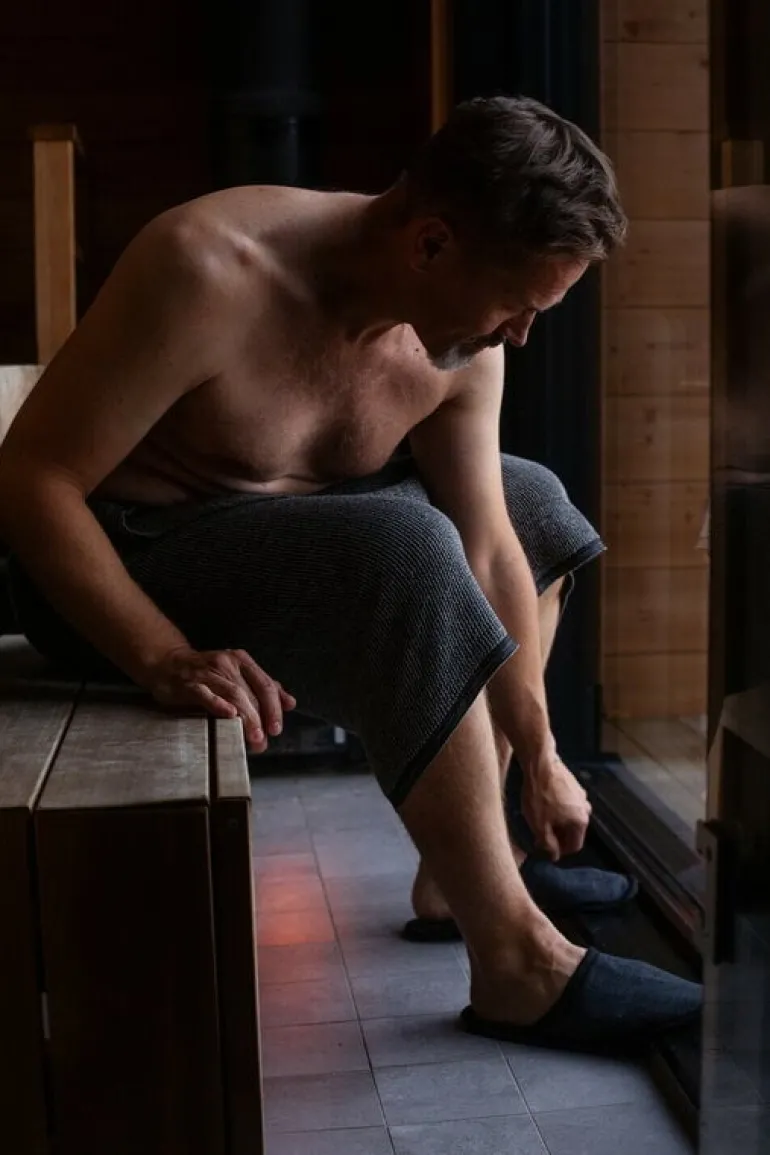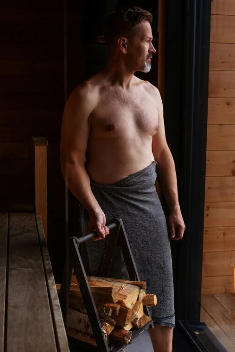 Den stora handduken Terva från Lapuan Kankurit är det perfekta stället att svepa in sig i efter en varm dusch eller bastu. Den stora handduken är tillverkad av en innovativ blandning av europeiskt linne, tencel och bomull med Oeko-Tex-standard. Materialet är lätt, snabbtorkande och absorberande, och känns behagligt mjukt mot naken hud. Terva-kollektionen inkluderar handdukar, bastusitsöverdrag och badrockar i olika storlekar och material, tillverkade huvudsakligen i Lapuan Kankurits egna väveri i Lapua, Finland.