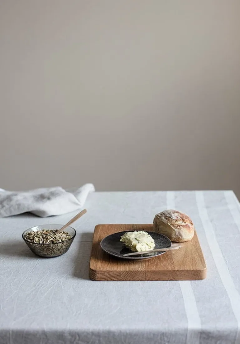 Bordsduken Usva, från Laupan Kankurit, är gjord av tvättat europeiskt linne, ett material som är enkelt att ta hand om och som har ett naturligt avslappnat utseende, perfekt för en rustik bordsdukning. Du behöver inte stryka bordsduken – små rynkor och veck ger den en avslappnad, naturlig look. Om du däremot föredrar en mer prydlig stil kan du stryka duken med strykjärnet inställt på linne. Bordsduken blir lättare och mjukare med varje tvätt, något som är karaktäristiskt för ofärgat linne.