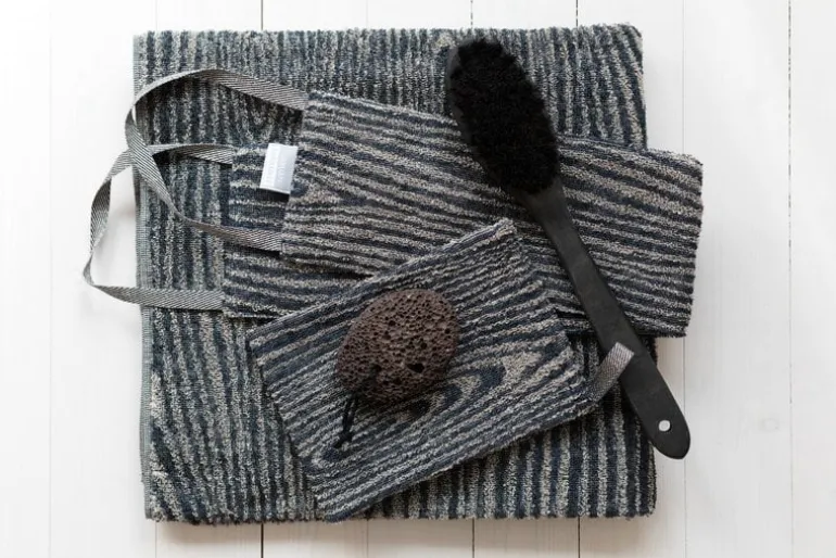 Viilu-badlakanet från Lapuan Kankurit pryds av Marja Rautiainens mönster som föreställer träfaner – Viilu är finska för ”faner”. Den högabsorberande frottéhandduken känns mjuk mot huden, och den är gjord av europeiskt linne och bomull. Handduken Viilu är vävd i Finland på Lapuan Kankurits väveri.