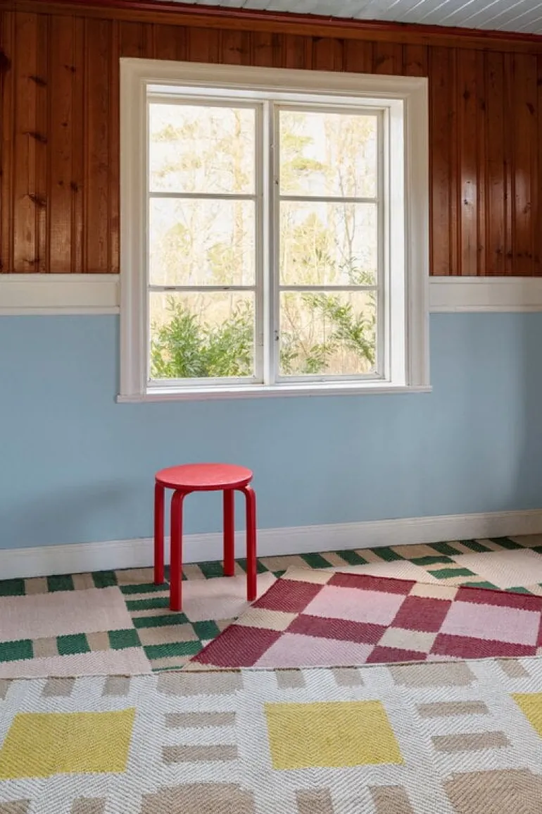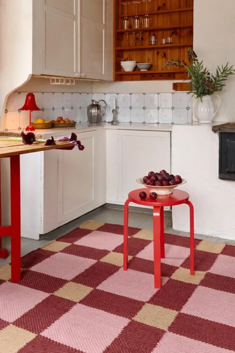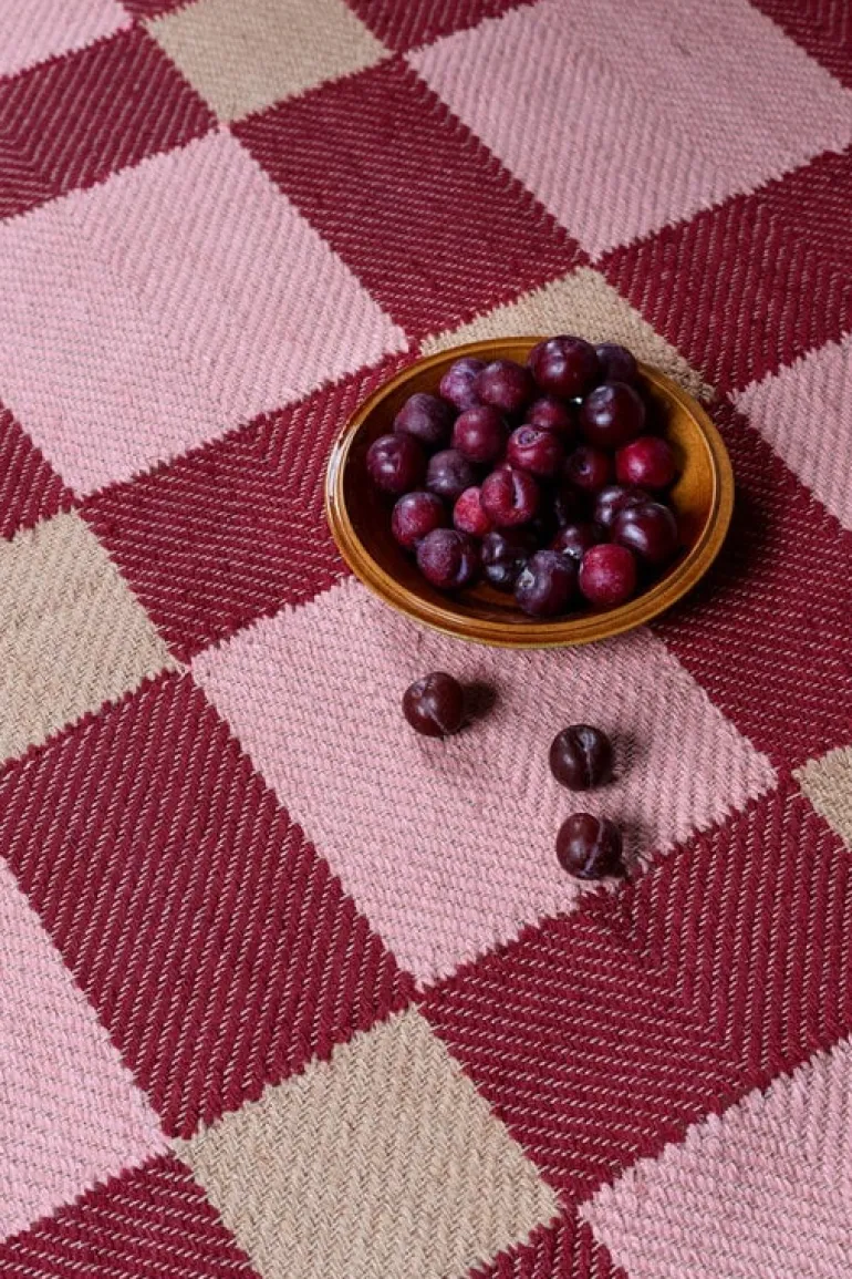 Jutemattan Plum Punch från LAYERED är prydd med ett grafiskt mönster, vars effektfulla uttryck dämpas av det charmiga färgschemat och naturmaterialet. Designen på mattan har skapats i samarbete med den svenska konstnären Evelina Kroon och suddar ut gränsen mellan konst och heminredning, och påminner oss om att vi inte alltid måste ta inredning på så stort allvar.