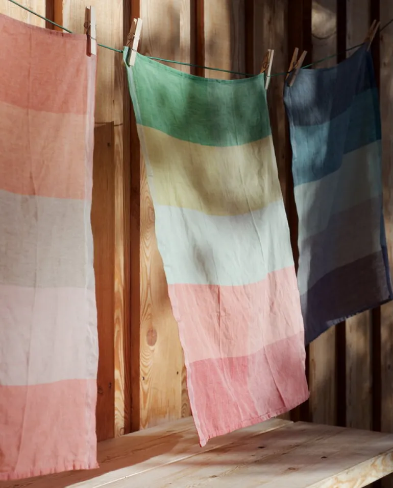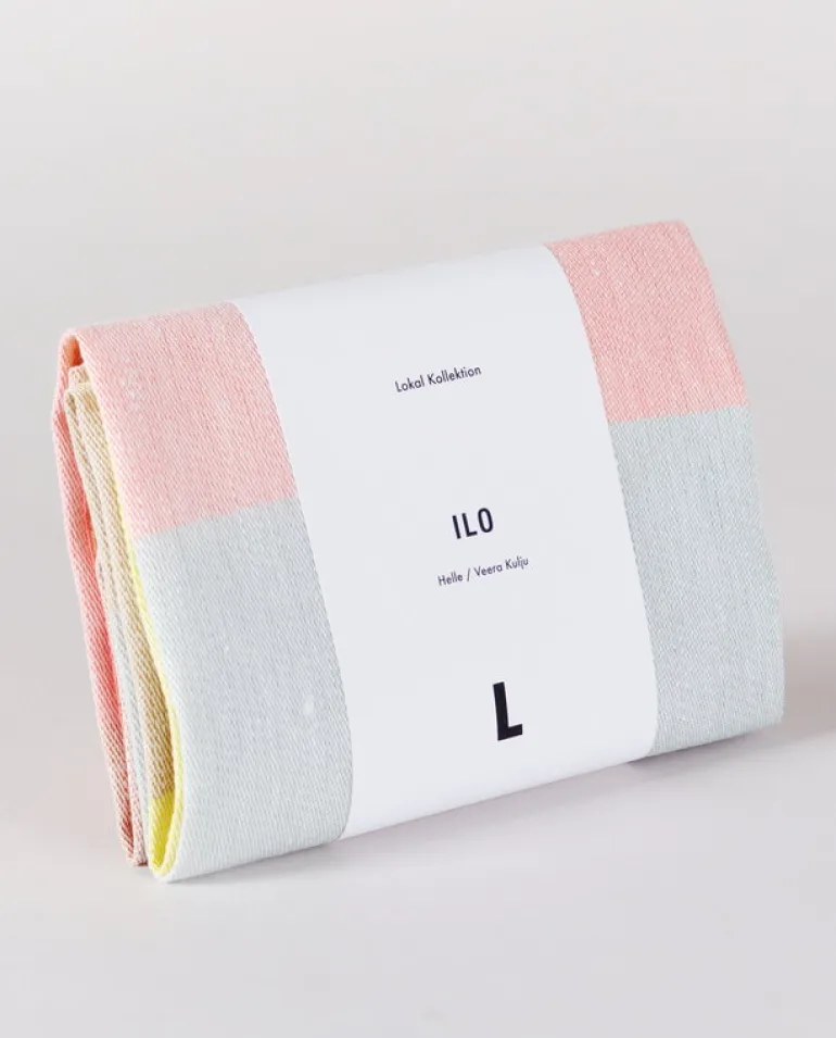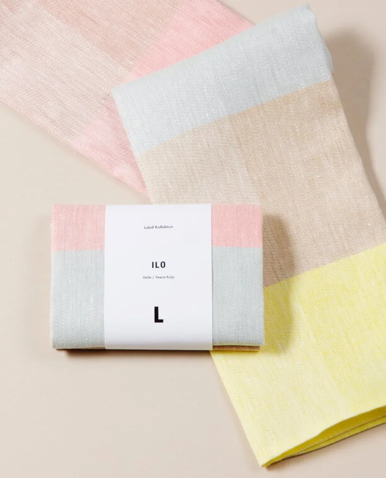 Kökshandduken Ilo från Lokal Helsinki är en handduk i linne som kan användas till mycket, som att torka disk med eller torka händerna på, eller täcka över en omgång kanelbullar som står på jäsning. Handduken, som formgivits av konstnären Veera Kulju, har harmoniska färger och skapar en lugn och rofylld stämning i köket.