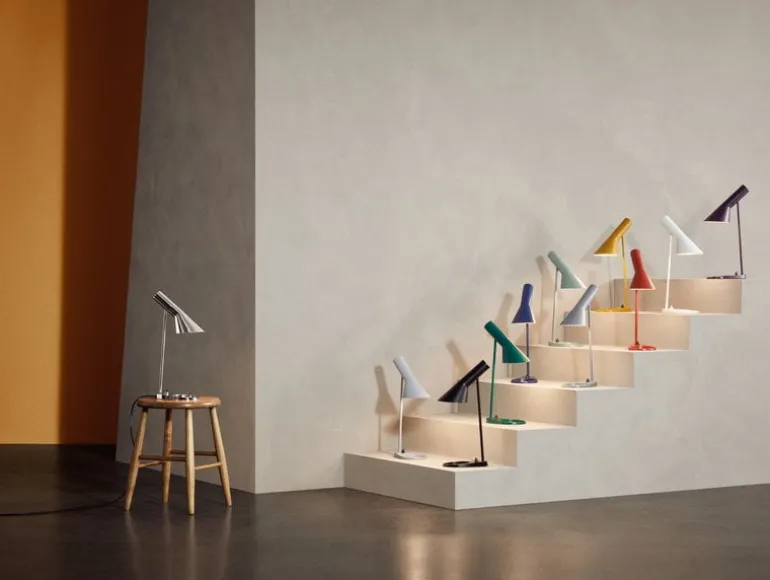AJ Mini bordslampan av Louis Poulsen är en mindre version av Arne Jacobsens klassiska design, den passar perfekt vid nattduksbordet eller fönsterbrädet. Den ikoniska utformningen hos Louis Poulsens AJ-kollektion kom till år 1957 när den legendariska danska arkitekten Arne Jacobsen designade SAS Royal Hotel i Köpenhamn, inklusive inredning och möbler. Den tidlösa lampan har en skulpturliknande form som skapats av grundläggande, geometriska former: en konformad skärm med en enkel cylinderfot. Den justerbara skärmen, som är vitmålad på insidan, ger i från sig ett mjukt, behagligt sken som inte bländar. AJ-kollektionen har kommit att bli en dansk designikon och ett av de mest älskade designverken som skapats av Arne Jacobsen.