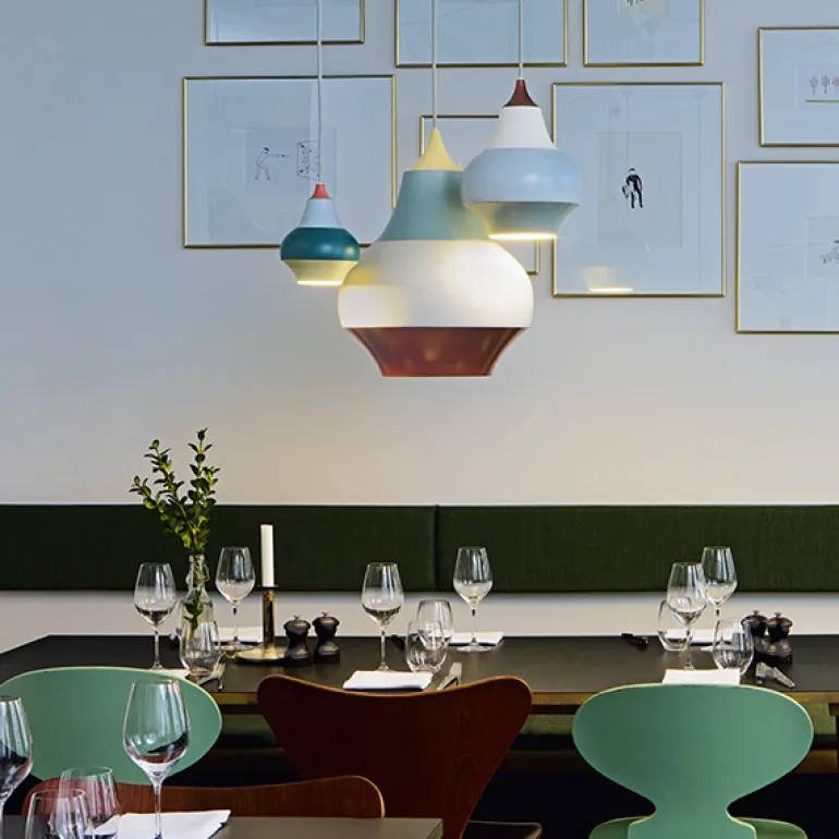| Louis Poulsens Cirque är en kollektion med lekfulla pendellampor, designade av svenska Clara von Zweigbergk. Deras glada och randiga design har inspirerats av Tivoli i Köpenhamn: färgerna och mönstren på karuseller och andra snurrande föremål smälter samman till horisontella färgband när de är i rörelse. Den förtjusande formen på skärmen speglar de lökformade kupolerna, som också kan ses i nöjesparken. Pendellamporna Cirque ger ett behagligt ljus nedåt och passar utmärkt över soff- och matbord. |