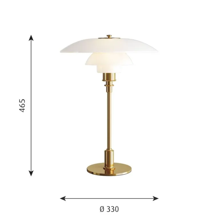 Den klassiska bordslampan PH 3½–2½ från Louis Poulsen har ett innovativt treskärmssystem som utvecklades av Poul Henningsen på 1920-talet. De tre munblåsta glasskärmarna med sandblästrad insida bildar en skulptural lampa som sprider ett trivsamt icke-bländande ljus och bidrar med tidlös elegans till alla rum. Basen i metalliserad mässing ger bordslampan PH 3½–3 ett varmt, sofistikerat ljus.