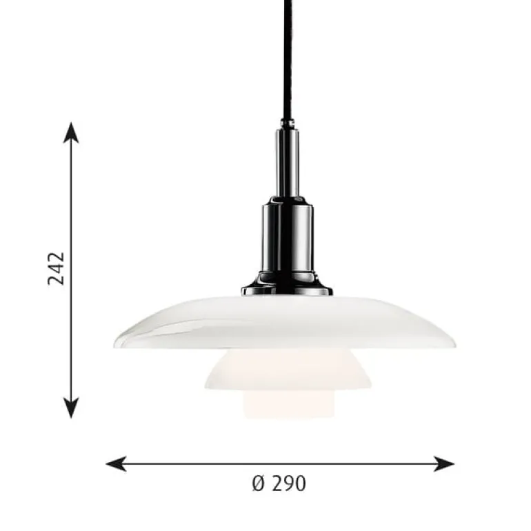 Pendellampan PH 3/2 av Poul Henningsen formgavs 1926 till utställningshallen Forum i Köpenhamn. Pendellampan PH 3/2 är baserad på ett system med tre reflekterande skärmar. Skärmarna till den vackra pendellampan är tillverkade av handblåst, vitt opalglas och har sandblästrade undersidor, detta för att skapa en unik belysning.