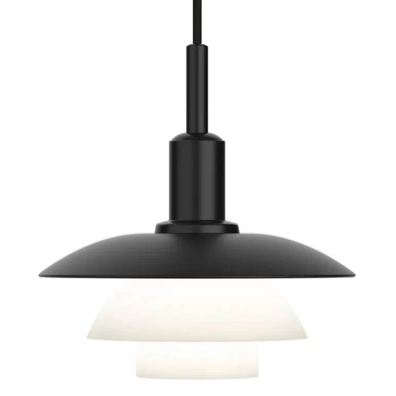 PH 3/3 hänglampans bas och övre skärm har målats matt svart för ett modernt, sofistikerat utseende, medan de två nedre skärmarna är gjorda av munblåst opalglas. Genom att kombinera dessa mycket olika material avger lampan ett varmt, mjukt sken som kan göras ännu mjukare med den frostat glasdiffusorn som ingår i paketet.