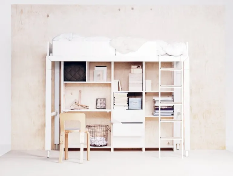 Lundias höga loftsäng Lofty har en fräsch, robust och anpassningsbar design. Extrautrymmet nedanför sängen kan användas på olika sätt, och sängen kan senare enkelt omvandlas till en vanlig låg säng eller våningssäng. Sängarna, som är tillverkade i vitlaminerad finsk björk, passar madrasser i måttet 90 x 200 cm och är lämpade för både barn och vuxna. Lundias Lofty-kollektion designades av Tapio Anttila som 2012 fick priset Furniture Designer of the year vid Finnish Designer Awards. Kollektionen tillverkas i Finland.