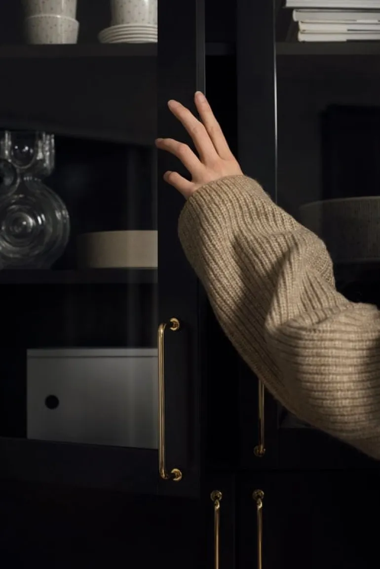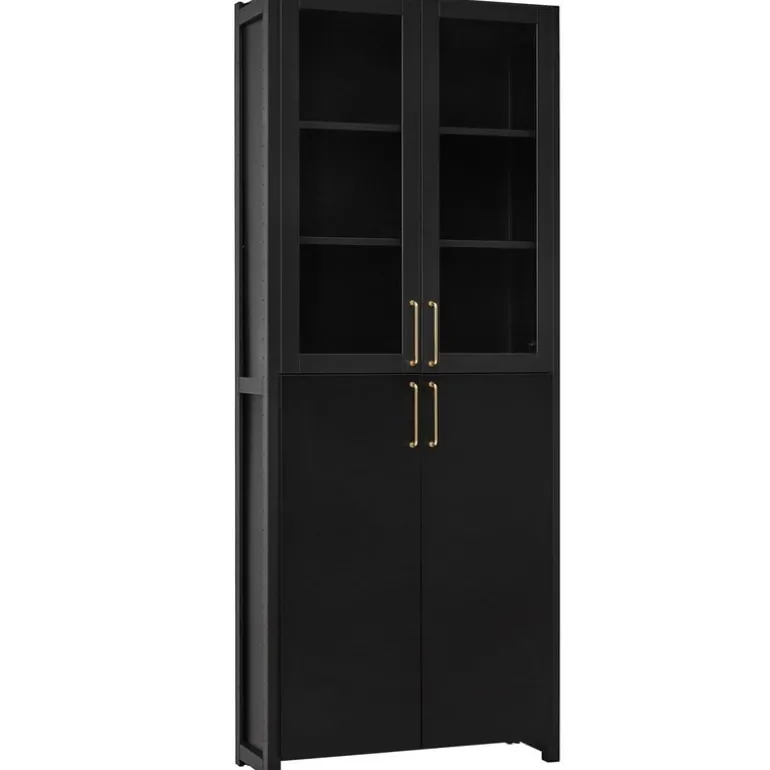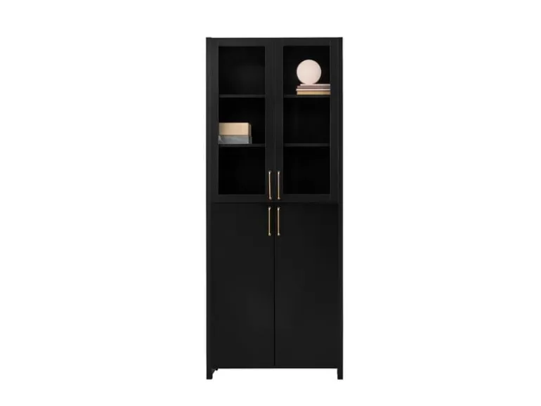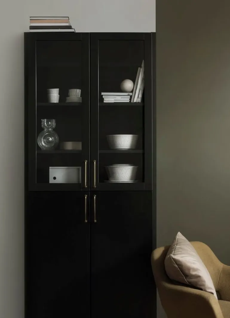 Lundias Moments-skåp är en djärv och rymlig kreation som tillverkats i svartlackerad finsk furu och fulländats med glasdörrar och mässingshandtag.