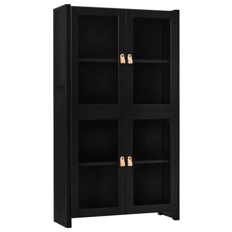 Lundias Moments-skåp är en djärv och rymlig kreation som tillverkats i svartlackerad finsk furu och fulländats med glasdörrar och läderhandtag med mässingsdetaljer.
