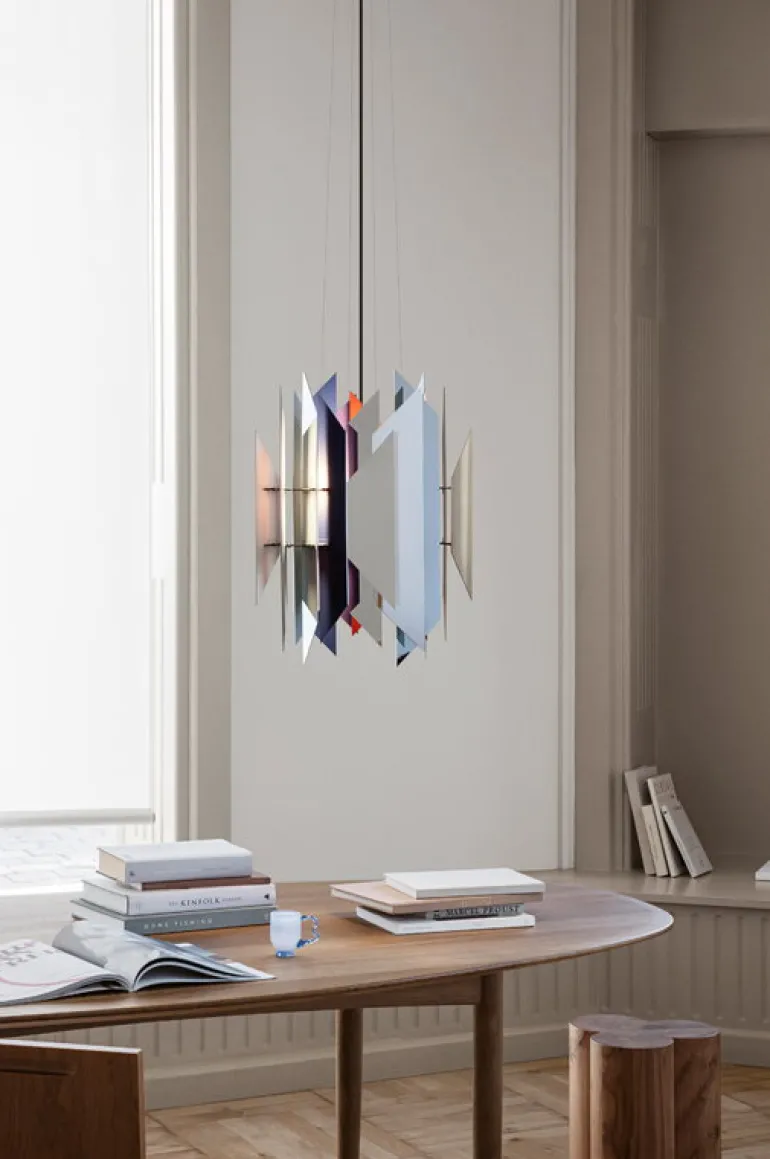LYFA:s Divan 2 är en imponerande hänglampa designad av Simon P. Henningsen 1962, bestående av överlappande ståltrapetser som noggrant monterats en efter en. Även om de definitivt gör armaturen ganska imponerande, är trapetsernas funktion inte bara estetisk: de filtrerar också ljuset på ett sätt som gör det behagligt och bländfritt. Som ett resultat ger Divan 2 hänglampa ett mjukt, indirekt ljus.
