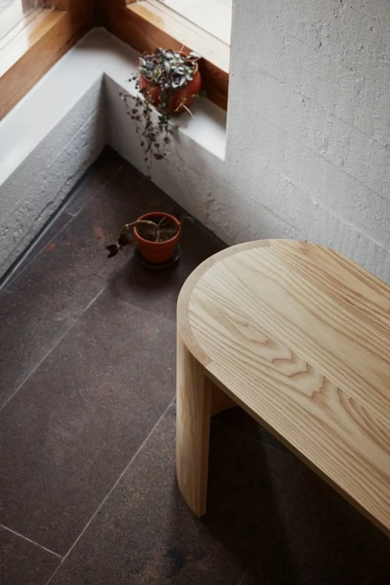 Bänken Airisto, designad av Joanna Laajisto för det finska designhuset Made By Choice, har mjuka, runda former och en asymmetrisk fotkonstruktion. Den minimalistiska och mångsidiga pallen är tillverkad av slitstarkt askträ och kan även användas som sidobord.