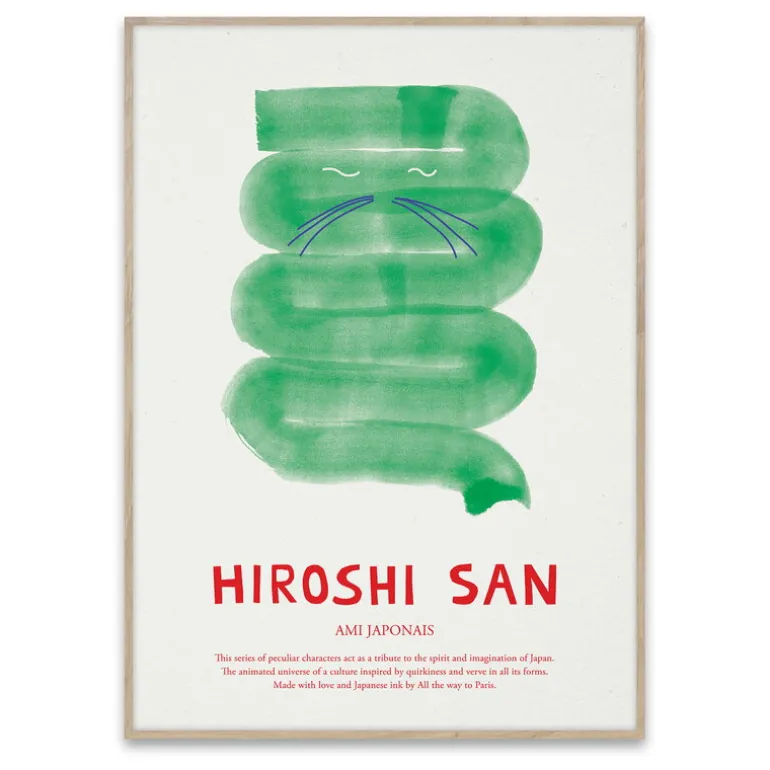 MADO:s Hiroshi San-poster presenterar en vänlig figur med morrhår, färgad i djupa gröna färger. Affischerna i Ami Japonais-kollektionen är designade av All The Way To Paris och inspirerade av den japanska animationens traditioner. De livfulla, genomskinliga färgerna är gjorda med japanskt bläck.