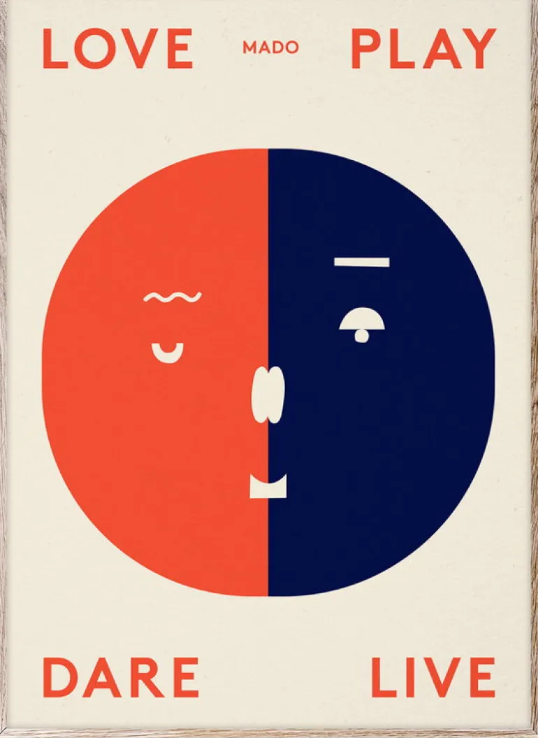 MADO:s poster Two Faces, formgiven av den Köpenhamnsbaserade studion All The Way To Paris, utgör ett grafiskt och lekfullt inslag på väggen, samtidigt som den lockar till diskussion om känslor och emotionella färdigheter. De två ansiktena omges av ord som uppmanar barnen till att utforska alla de sinnesstämningar och känslor som gör oss mänskliga.