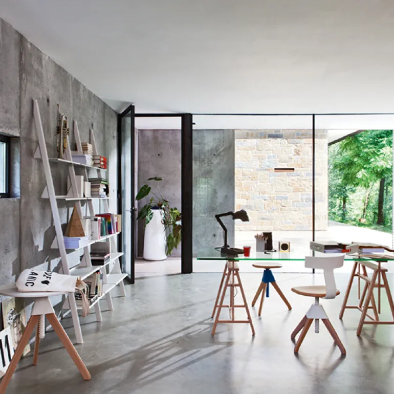 Tom och Jerry från Magis är Konstantin Grcics lekfulla tolkning av den typiska verkstadspallen. Ramen är tillverkad i massiv bok och de mekaniska delarna utgörs av självsmörjande polypropen. De färgglada, friktionsfria plastdelarna är en rolig kontrast till träbenen och sitsen, och gör pallarna enkla och trivsamma att använda. Barstolen Tom är perfekt till barer och köksöar, medan den lägre pallen Jerry passar lite överallt, från kontor till barnrum.
