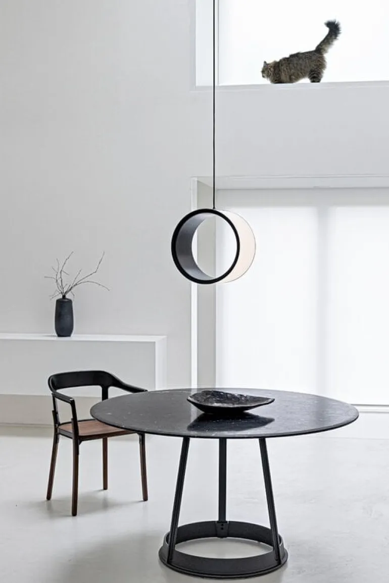 För att ytterligare understryka den ovanliga designen – som för att markera tomrummets gräns – har formgivarna beslutat sig för att placera LED-elementet runt lampans utsida istället för på insidan, som du annars kanske skulle ha förväntat dig. Det här komplicerade tekniska beslutet ger upphov till en effektfull grafisk bild som får dig att tänka på ett svart hål eller kanske en månförmörkelse, särskilt ur en viss vinkel där bara en mycket smal månskära syns lysa.