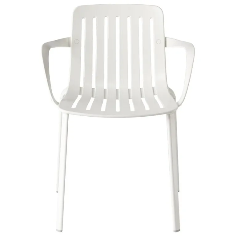 Tillverkad av återvinningsbart aluminium, har Plato en slank men robust struktur komplett med armstöd, och polyesterfärgen gör den helt väderbeständig. Den böjda sitsen är behaglig att sitta på, och tack vare luckorna kan regnvatten lätt rinna ner. Den mångsidiga och stapelbara Plato passar lika bra för inomhus och utomhus matning samt kontor och konferensanvändning.