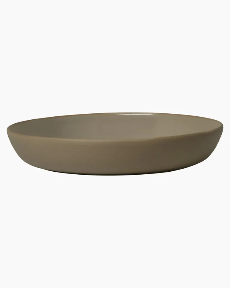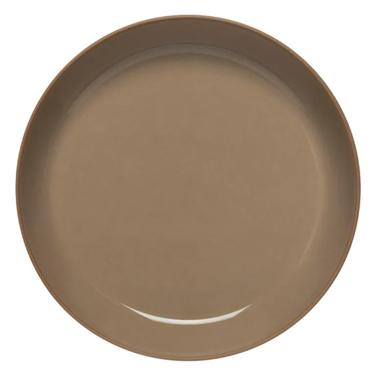 Marimekkos Oiva tallrik kombinerar en elegant, minimalistisk form med en rustik touch. Tallriken är gjord i brunt stengods utan glasyr på utsidan, vilket ger den en spännande, grov yta och ett organiskt utseende. Den rustika känslan förhöjs av de naturligt varierande färgerna som är karakteristiskt för materialet, och som gör varje tallrik unik.