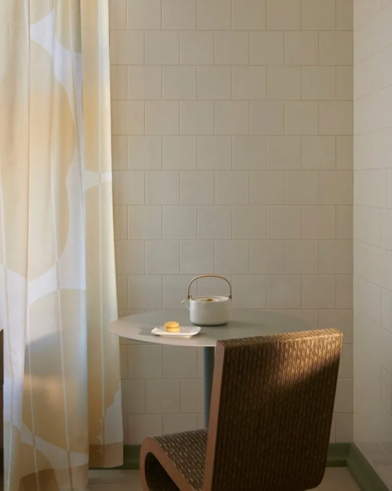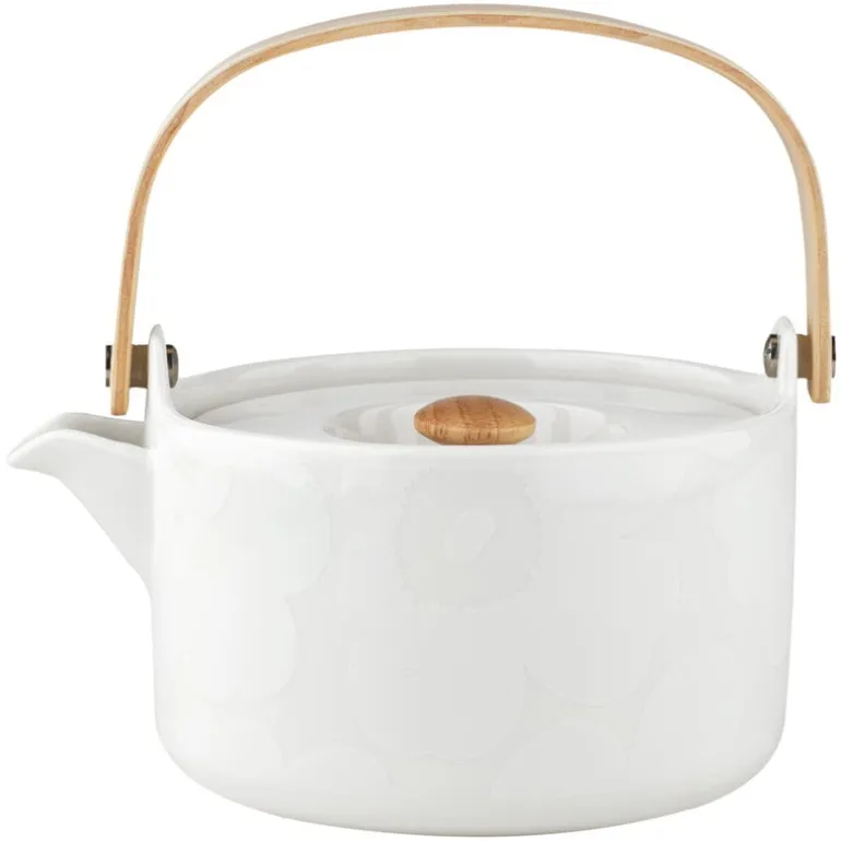 Tekannan Unikko från Marimekko är prydd med Maija Isolas ikoniska blommönster i naturvita toner. Tekannan i keramik är del av Sami Ruotsalainen stilrena servis Oiva. Den har vackra handtag av gummiträ och rymmer 7 dl.