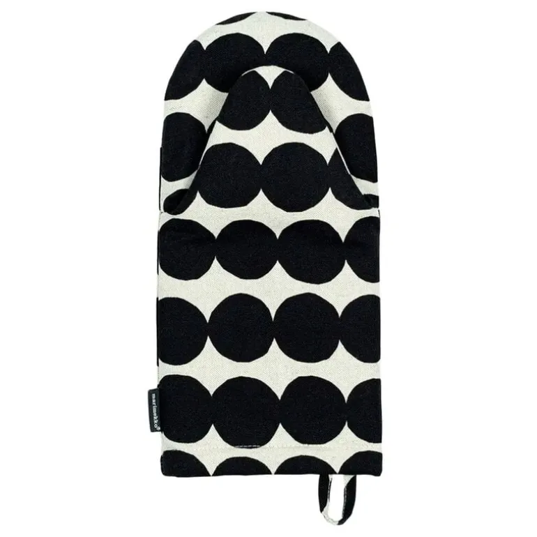 Marimekkos grytlapp Räsymatto bär Maija Louekaris vackra mönster som föreställer texturen hos en traditionell trasmatta, på ett förtjusande grafiskt sätt. Den vadderade grytlappen är tillverkad av delvis återvunnet bomulls- och linnetyg och har en praktisk ögla för upphängning. Fullända köksinredningen med andra textilier ur kollektionen Räsymatto.