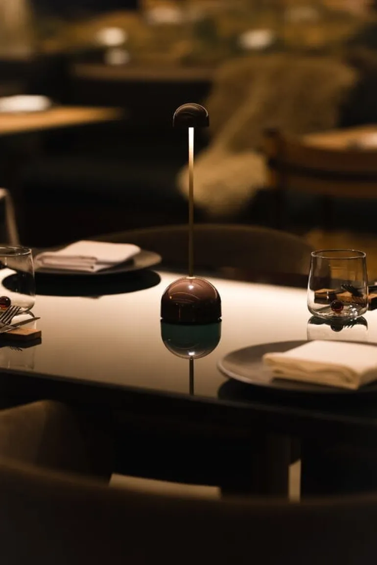 Enligt Mathieu är skärmens blygsamma storlek ett resultat av hans önskan att inte skapa visuella barriärer mellan middagsgästerna. Produkthöjden är också genomtänkt – ungefär som en vinflaska ger den ett stämningsfullt, bländfritt sken från precis rätt vinkel.