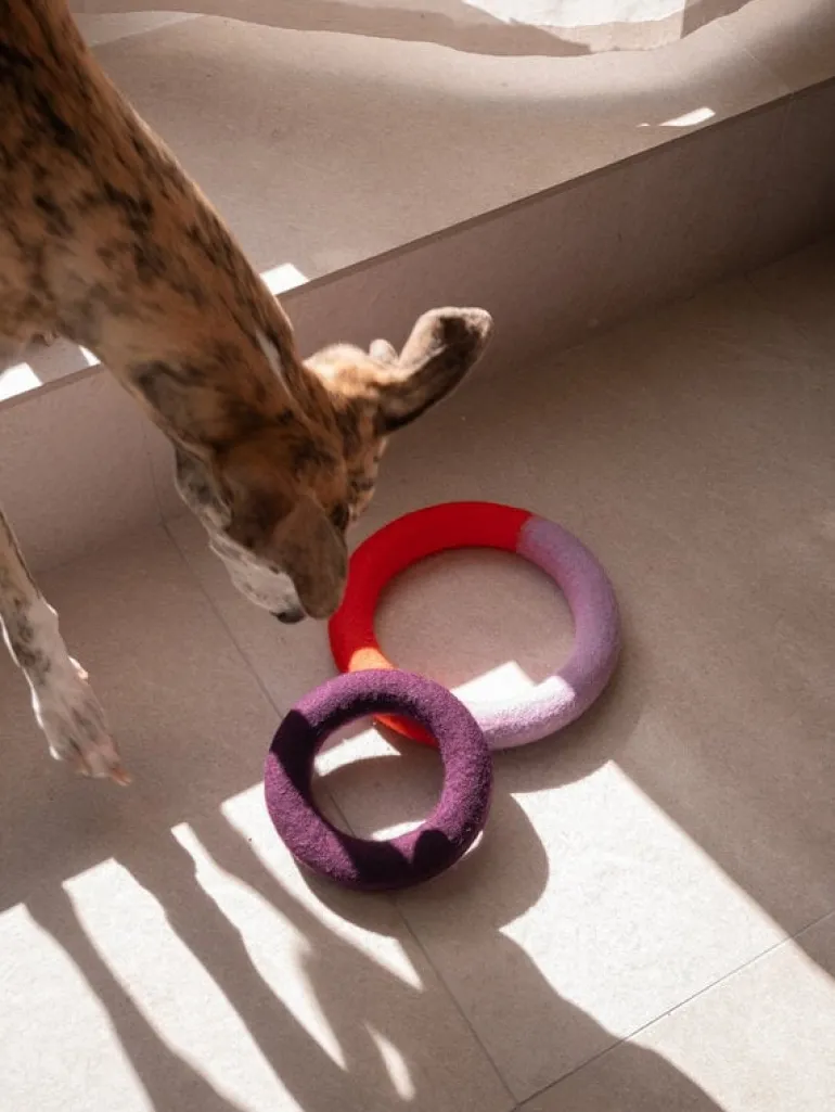 Masimalos leksak Duo Circle ger hundens lekstund en färgglad touch av elegans. Leksaken är handgjord i Lettland av 100 % ull och tål att tuggas, naggas, klös på och lekas med i all oändlighet. Leksaken håller hunden underhållen och främjar dess tandhälsa. Om leksaken känns för hård efter en stunds lek kan du enkelt mjuka upp den genom att tvätta den.