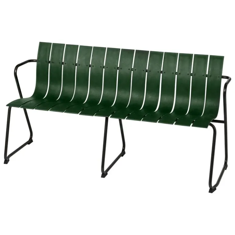 Ocean OC2-bänken från det danska varumärket Mater är en del av dess prisbelönta Ocean-kollektion – en tolkning av utemöbelserien designad av Nanna & Jørgen Ditzel 1955. Förutom den exceptionellt harmoniska formen gör även materialen Ocean OC2-serien mycket unik: kollektionen har tillverkats med återvunna plastfat från öl i samarbete med den danska öltillverkaren Carlsberg. Sitsarna och bordsskivorna är formade av starka plastlameller, med den bekanta mörkgröna nyansen, och den luftiga designen kompletteras av en metallram med en finish i gunmetal. Alla komponenter är återvinningsbara.