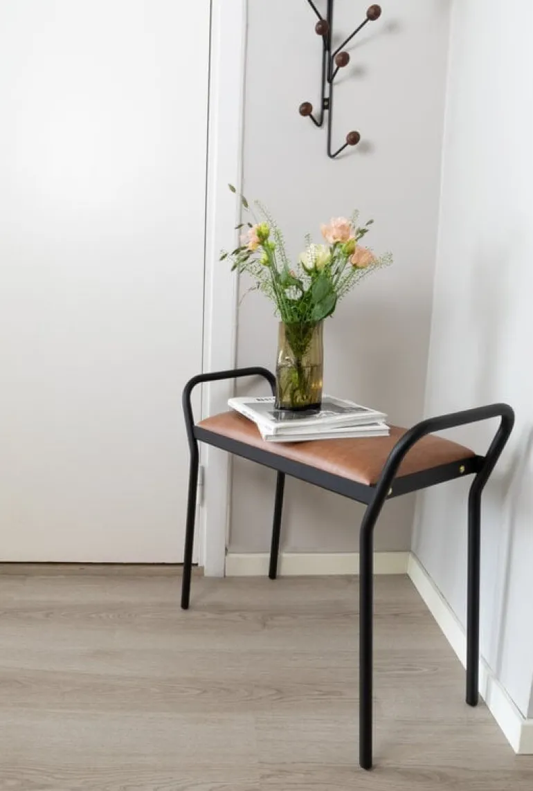 Anyone från Maze ger extra sittplats när och var du än behöver det! Den läderklädda metallpallen är en perfekt sittplats i hallen eller vid en skänk, och tack vare de praktiska handtagen är den lätt att flytta in i vardagsrummet, där den kan bli en extra sittplats för gäster. Pallen är svensktillverkad och ingår i Mazes kollektion Pieces, som tillverkar slow production-möbler i små upplagor.