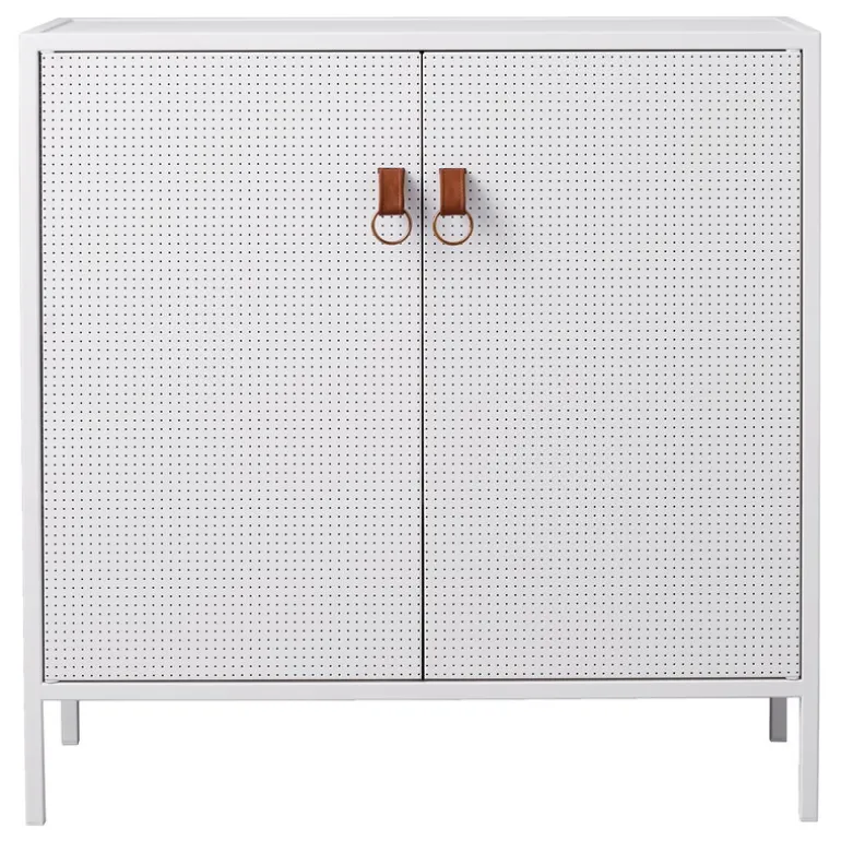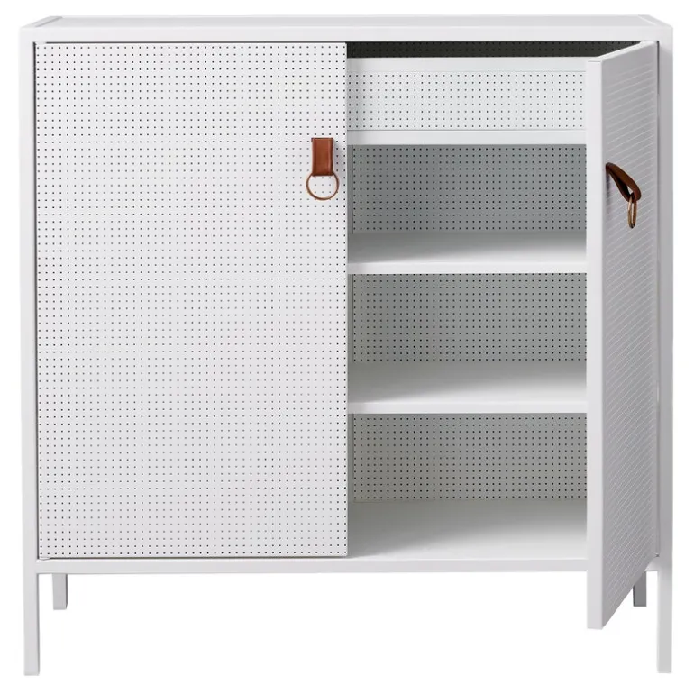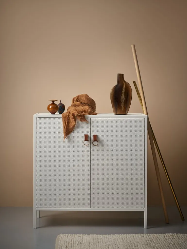 Maze:s Liza skåp är en stilfull och praktisk förvaringsenhet för alla rum i ditt hem. Skåpet är designat av Louise Hederström och tillverkat av perforerad metall med detaljer i läder som ger designen en distinkt touch. Liza är en vacker kombination av klassisk och modern estetik och passar väl in i en mängd olika utrymmen och för olika ändamål. Inuti hittar du tre hyllor och en utdragbar låda.