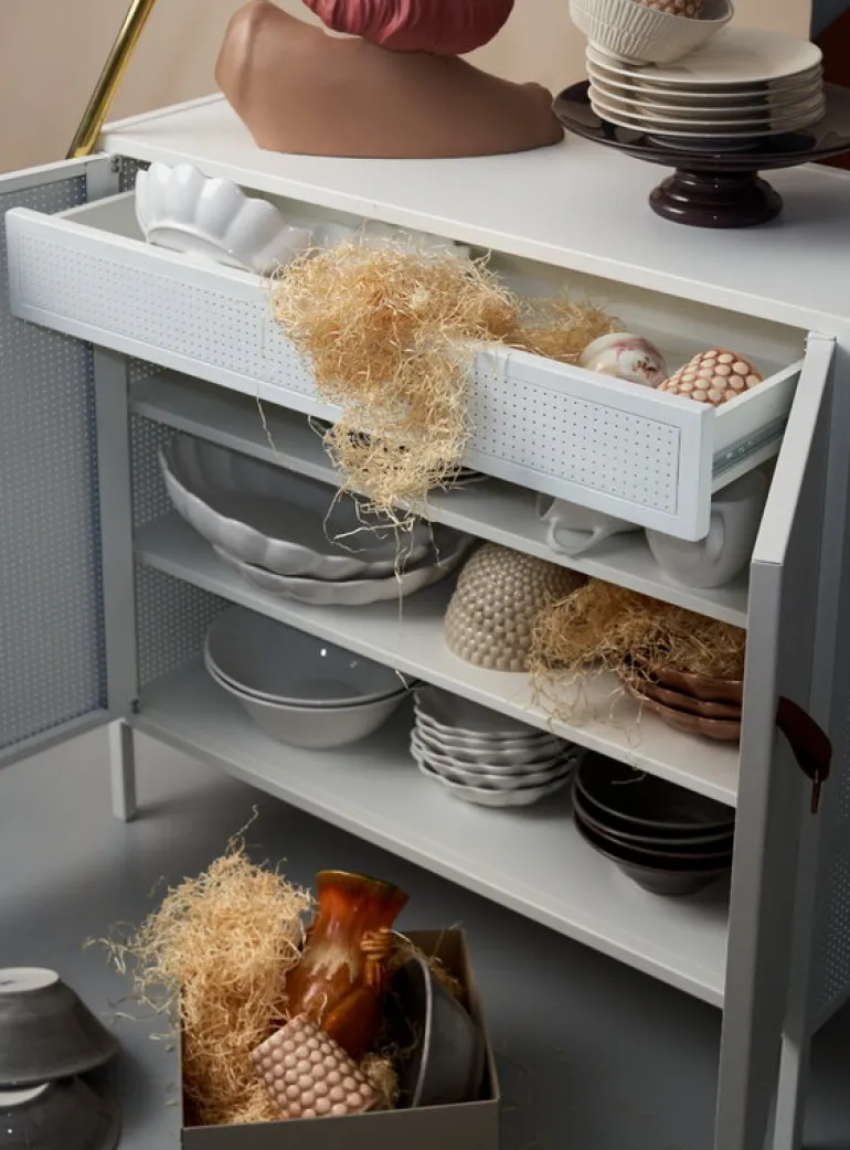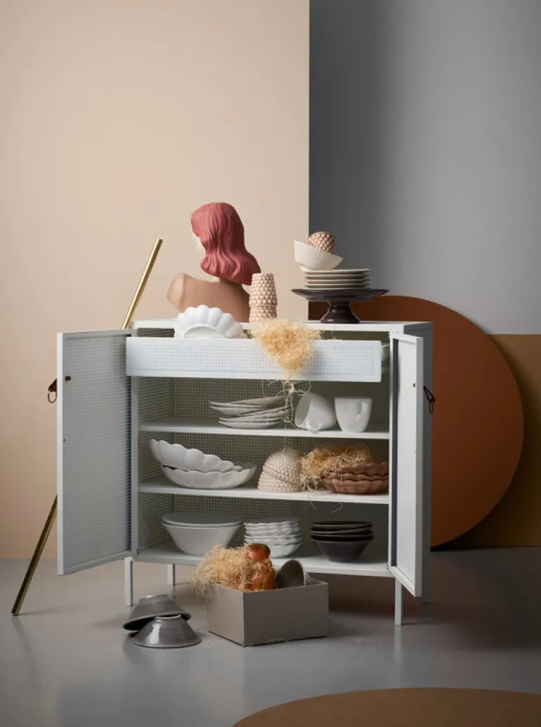 Liza skåpet är en del av Maze:s Pieces kollektion som innehåller svensktillverkade möbler tillverkade enligt varumärkets Slow Production-tänkande: målet är att stödja lokal produktion med hjälp av hållbara material och metoder. Varje del i kollektionen är tillverkad i små upplagor och tillverkad med största omsorg – de är gjorda för att älskas och värderas i decennier framöver.