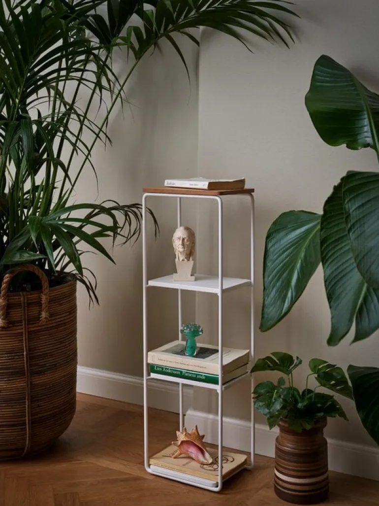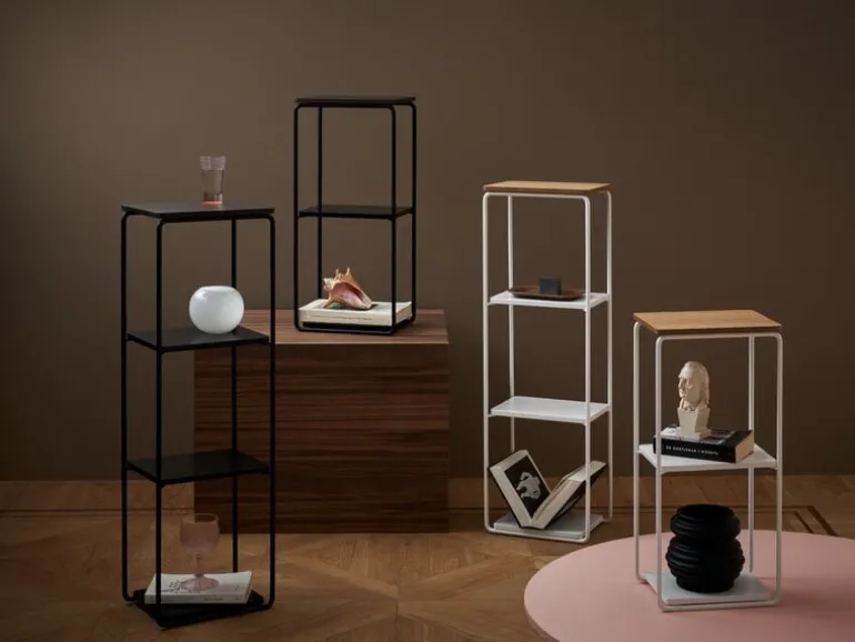 Golvhyllan Mixrack L från Maze, formgiven av Tapio Anttila, består av fyra hyllplan som är uppburna av en metallram. Ekfaneret på det översta hyllplanet ger den i övrigt industriella designen en trevlig, organisk touch. Den minimalistiska och praktiska golvhyllan är fristående och har flera användningsområden – du kan exempelvis använda den som nattduksbord, blompiedestal eller sidobord i det rum du önskar. Det går även att placera flera Mixrack-hyllor i rad eller para ihop hyllan med andra delar i Mixrack-kollektionen.